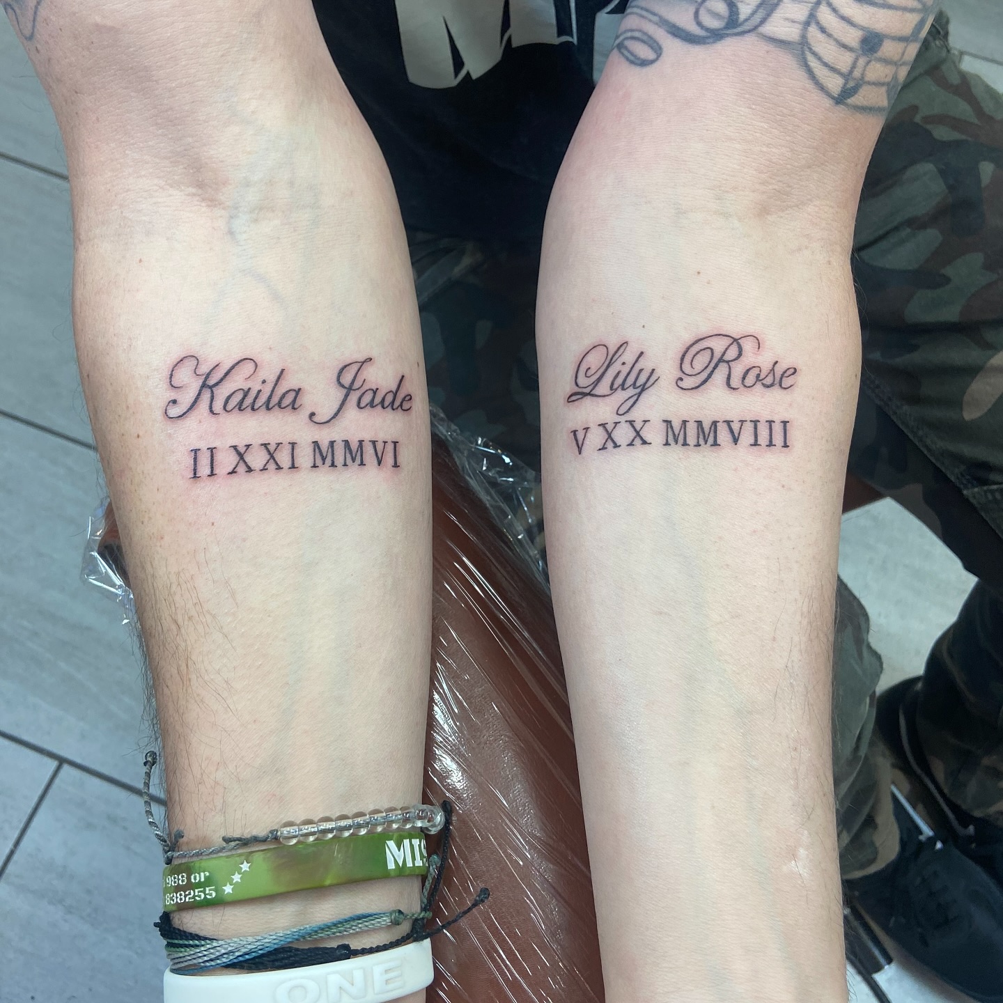 These matching forearm tattoos pair elegant script names with clear Roman numerals placed directly underneath, creating a clean and organized look.