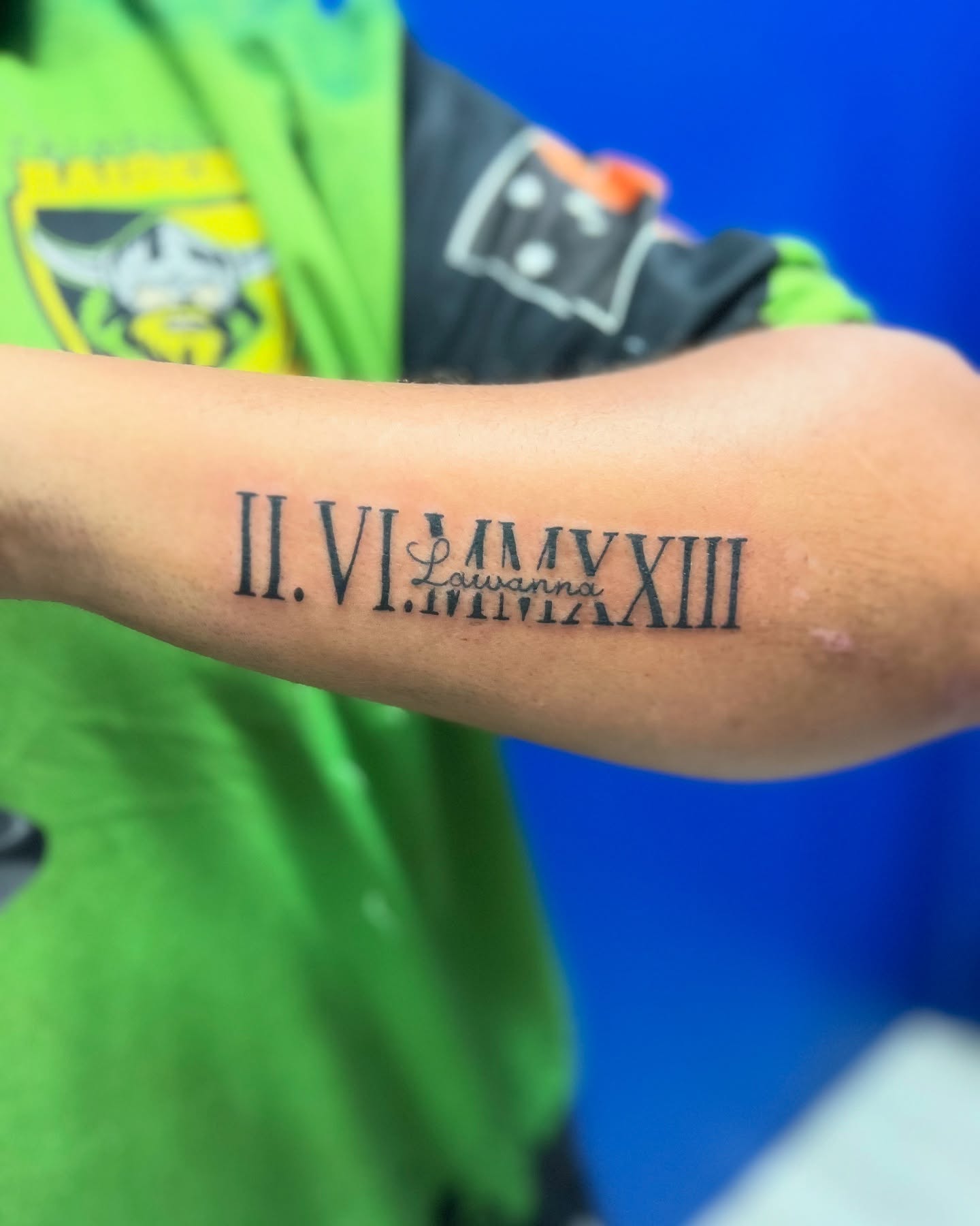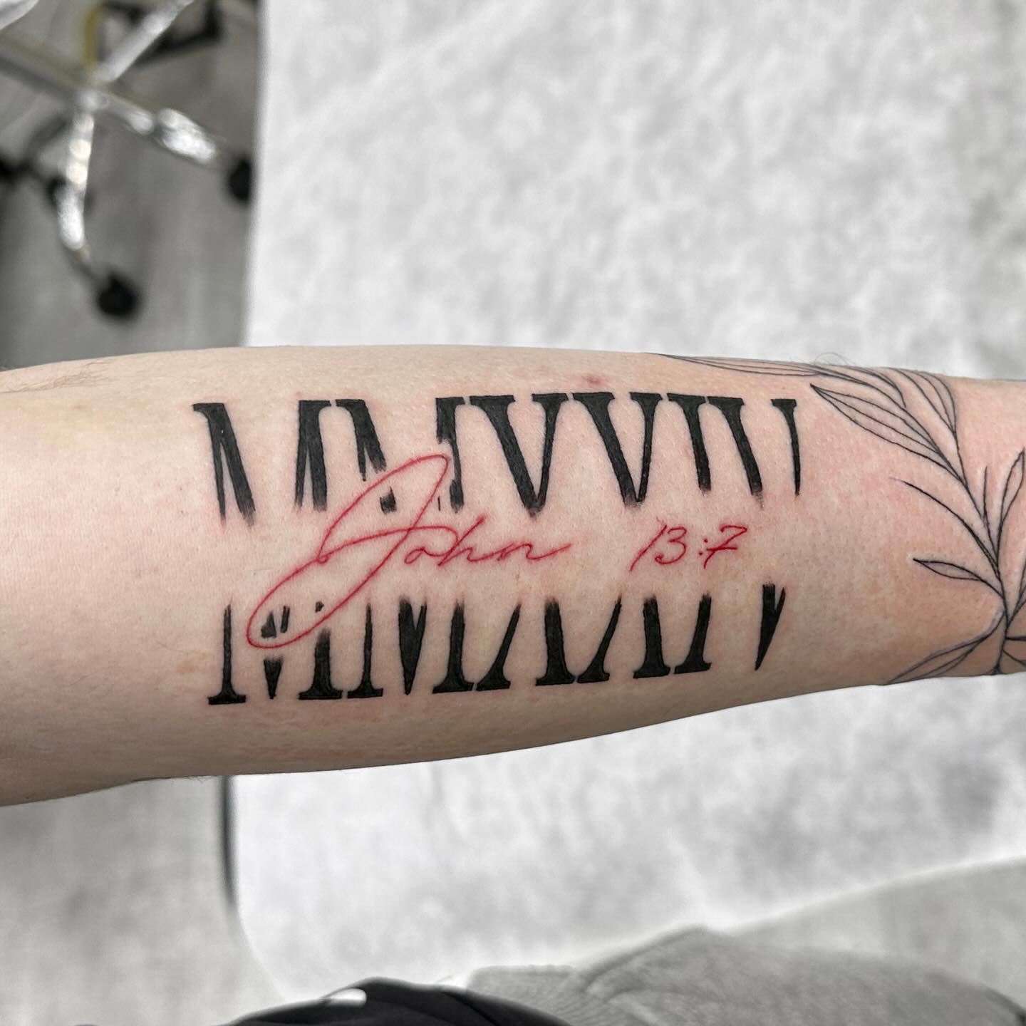 This tattoo places bold Roman numerals along the forearm, giving the design a clean and structured look that stays easy to read.