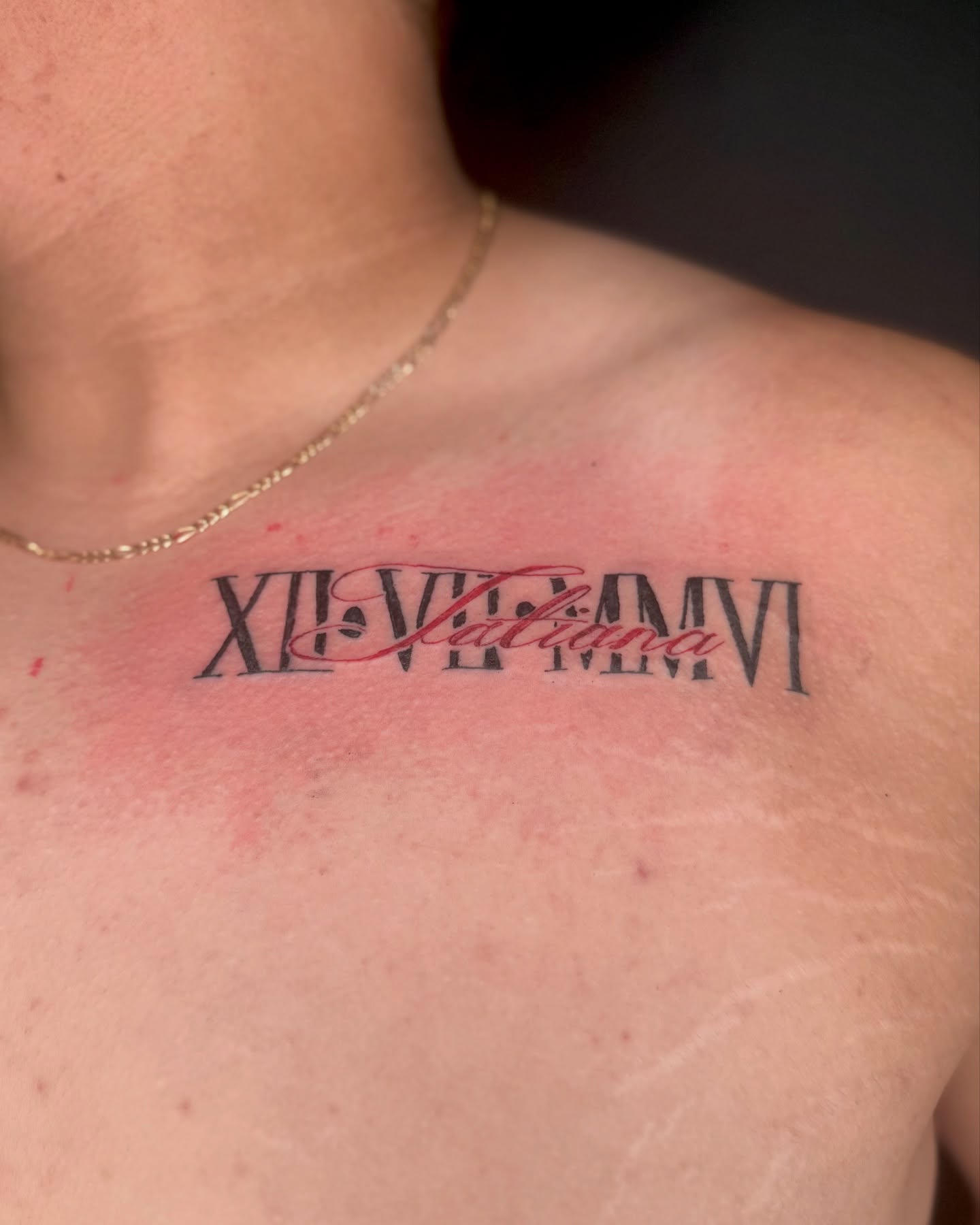 This chest tattoo blends bold Roman numerals with a flowing script name written across the center.