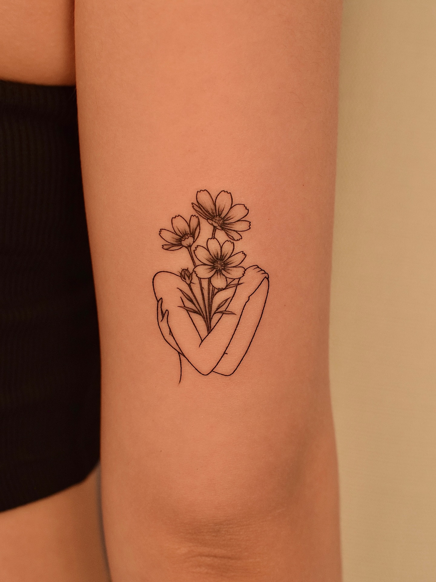 This tattoo shows a woman hugging herself while a cluster of blooming flowers rises from her arms, creating a gentle balance between strength and softness.