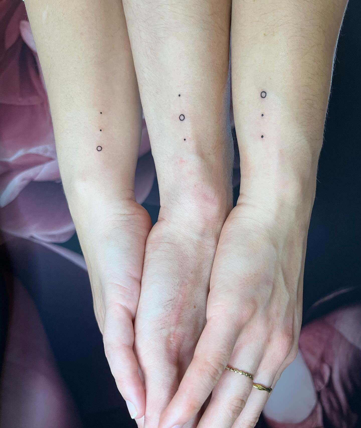 This sibling tattoo uses a vertical line of tiny dots with one small circle to mark each person’s birth order.