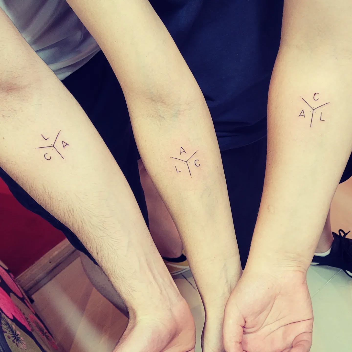 This sibling tattoo arranges three initials around a simple set of intersecting lines, creating a clean symbol that represents their bond.