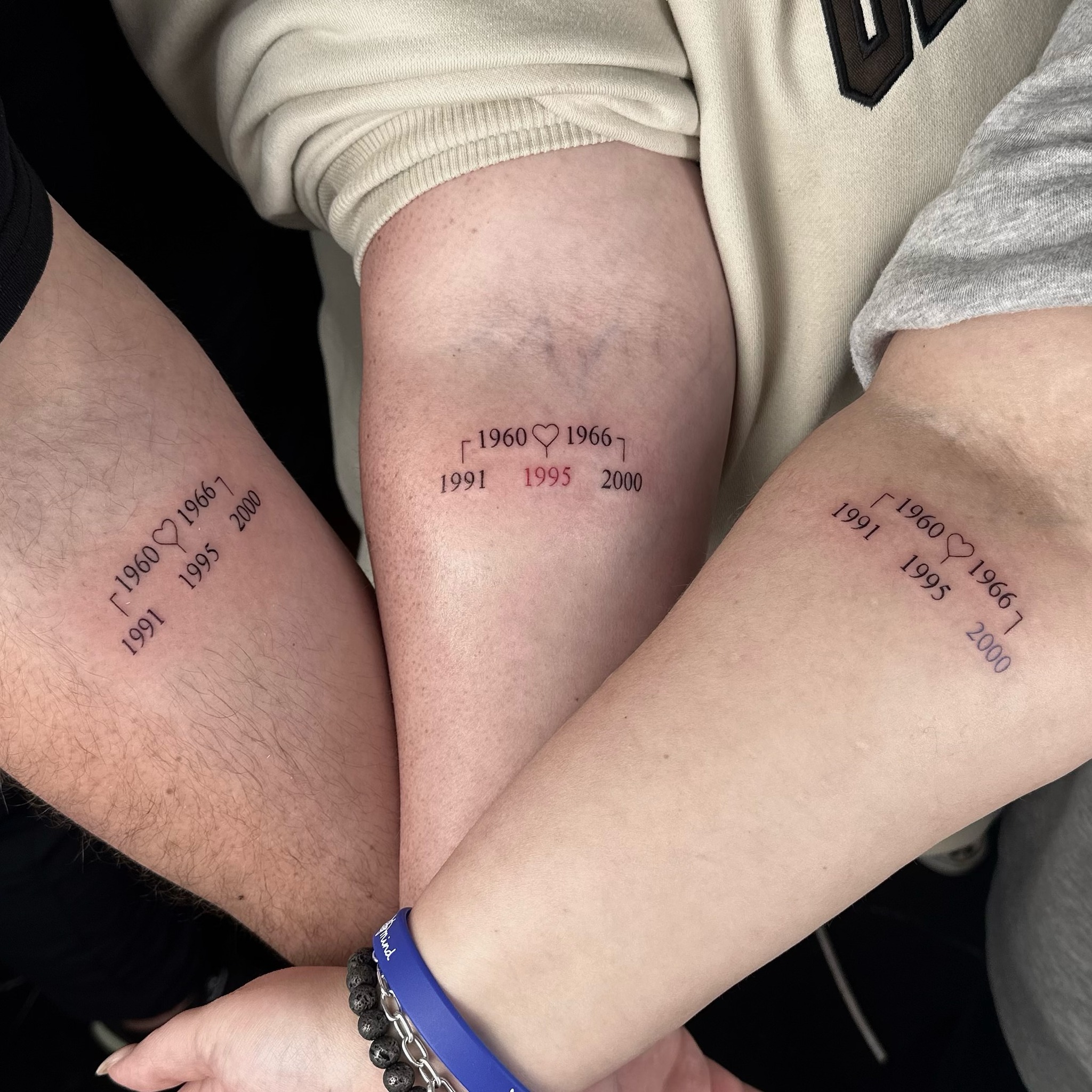 One date is highlighted in a different color on each sibling, showing each person’s own birth year while keeping the shared design consistent. The brackets on the top row frame the years nicely and give the tattoo a structured look.