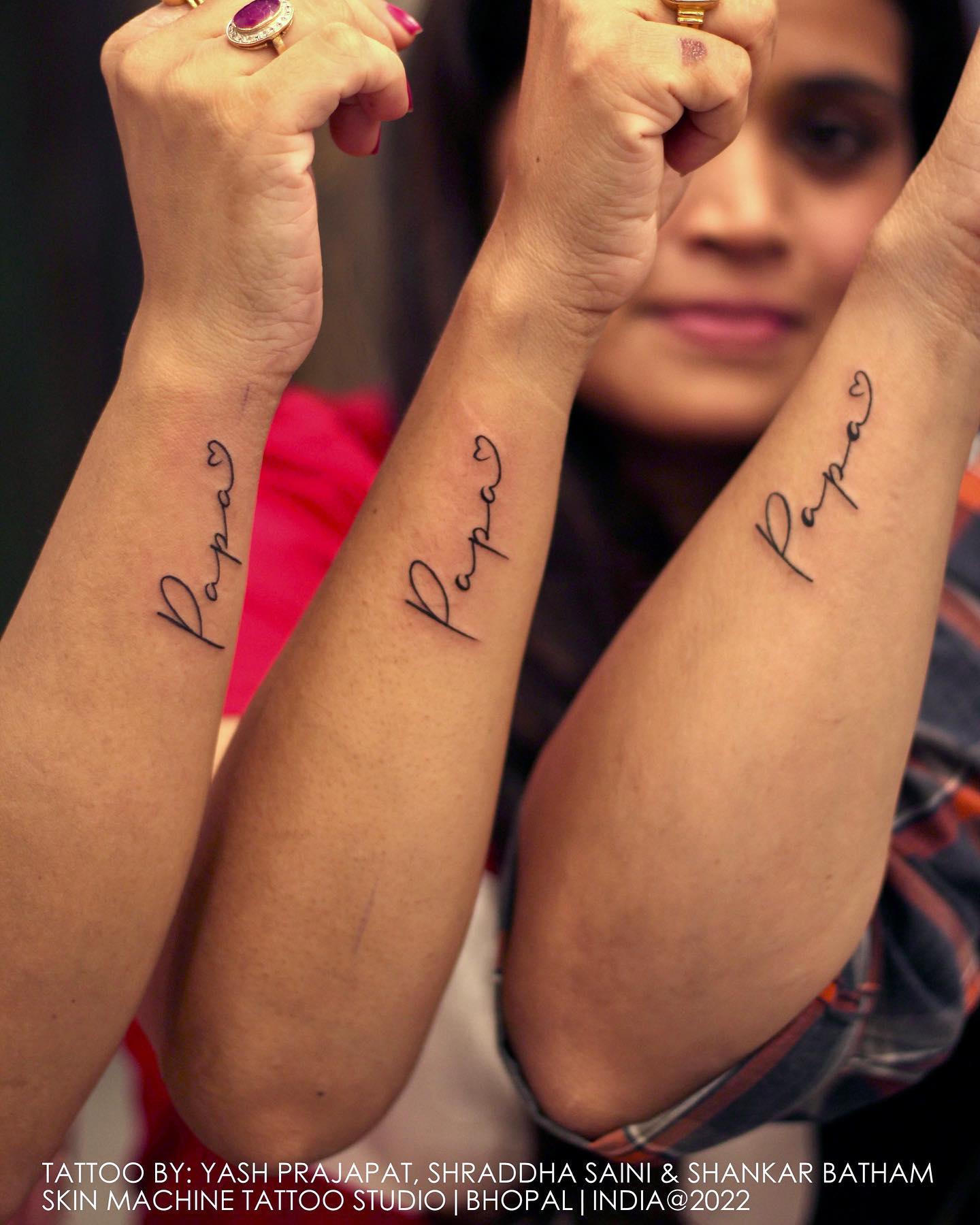 This sibling tattoo features the word “Papa” written in a clean, flowing script, with a small heart added to the final stroke.