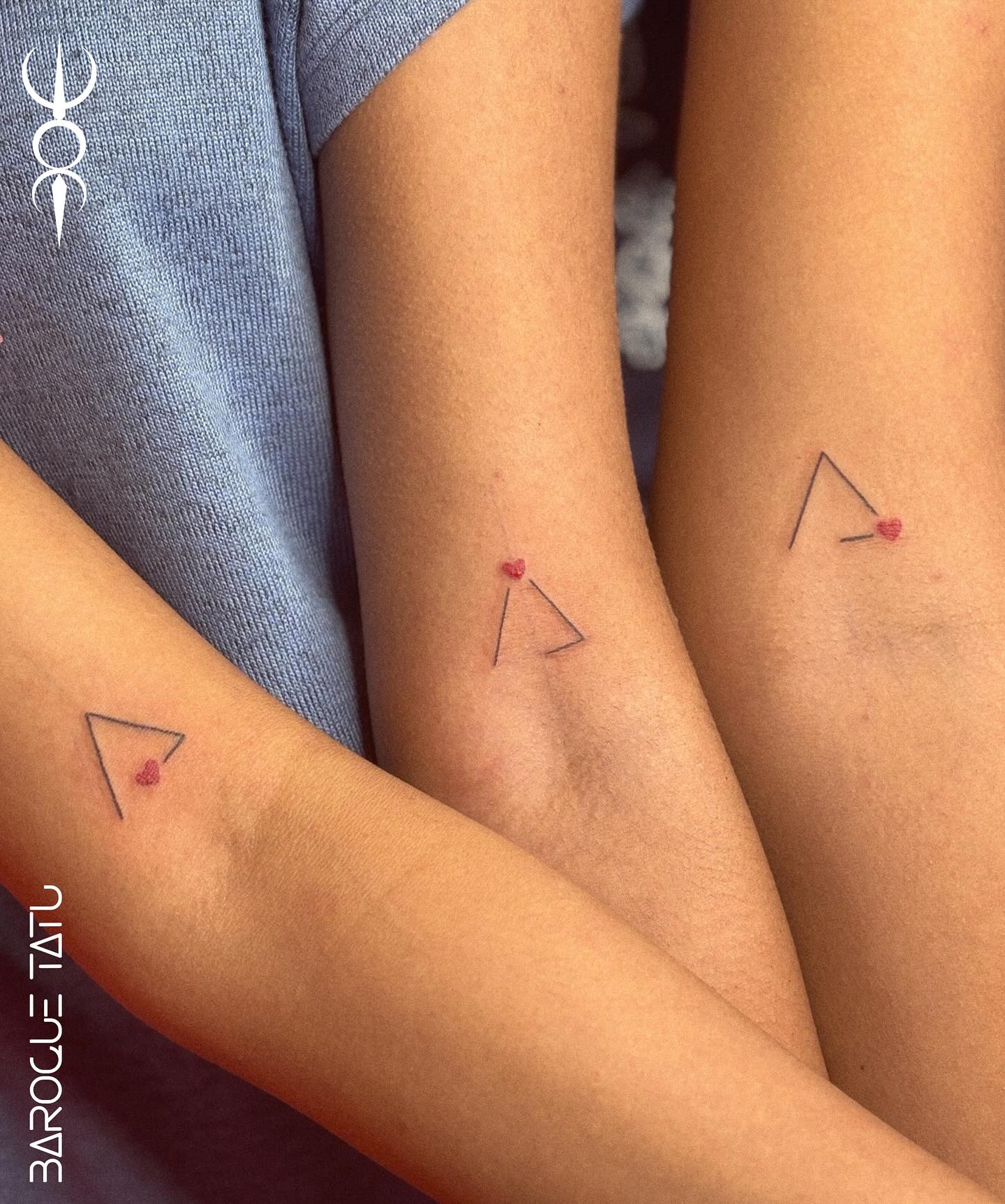 Every tattoo includes the same shapes, but the level of shading changes to show birth order, with the darkest triangle marking the sibling’s position. Small dotted accents add a soft touch without crowding the design. The clean lines and geometric structure keep everything modern and balanced.