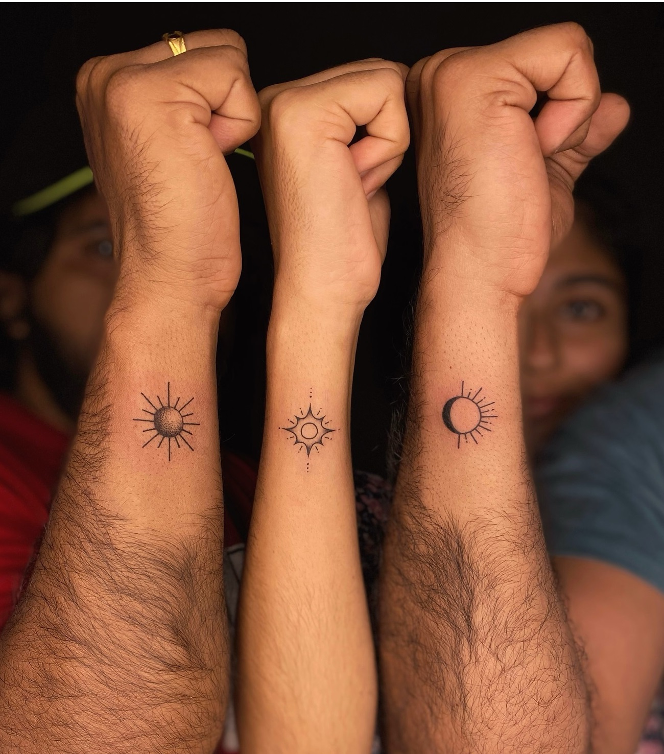This trio tattoo highlights the bond between siblings through three connected celestial designs.