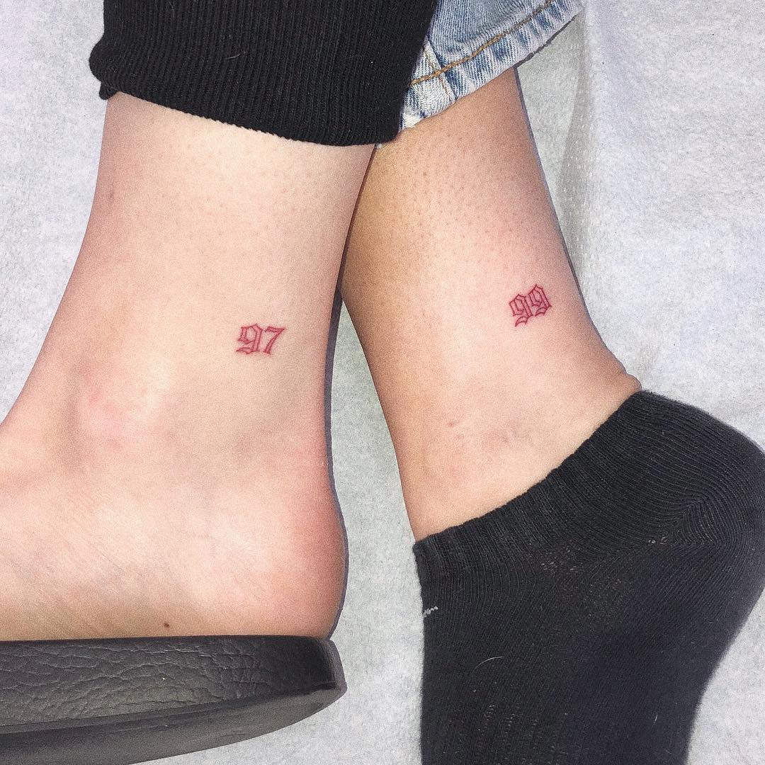 These matching sister tattoos feature small birth years written in red Old English lettering, creating a bold look despite the tiny size.