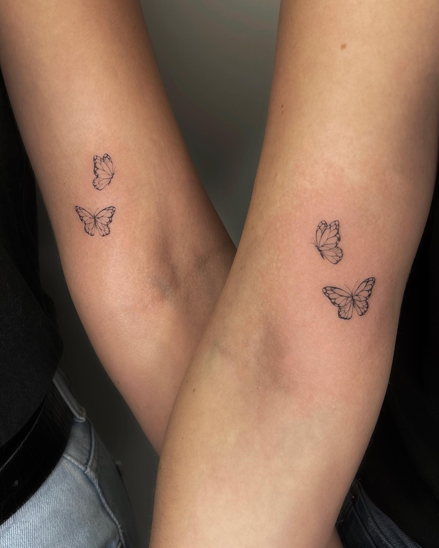 These matching sister tattoos show two delicate butterflies on each arm, placed to look like they’re gently drifting upward.
