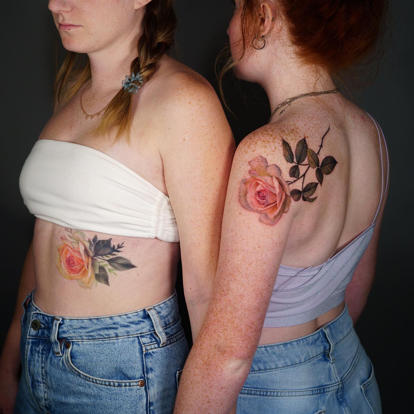 Even though the roses vary in placement and color, the shared flower ties the two tattoos together, showing how sisters can stay connected while growing in their own unique directions.