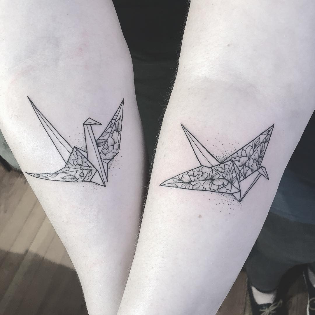 These matching sister tattoos feature two origami cranes drawn with clean, geometric lines that mirror folded paper.