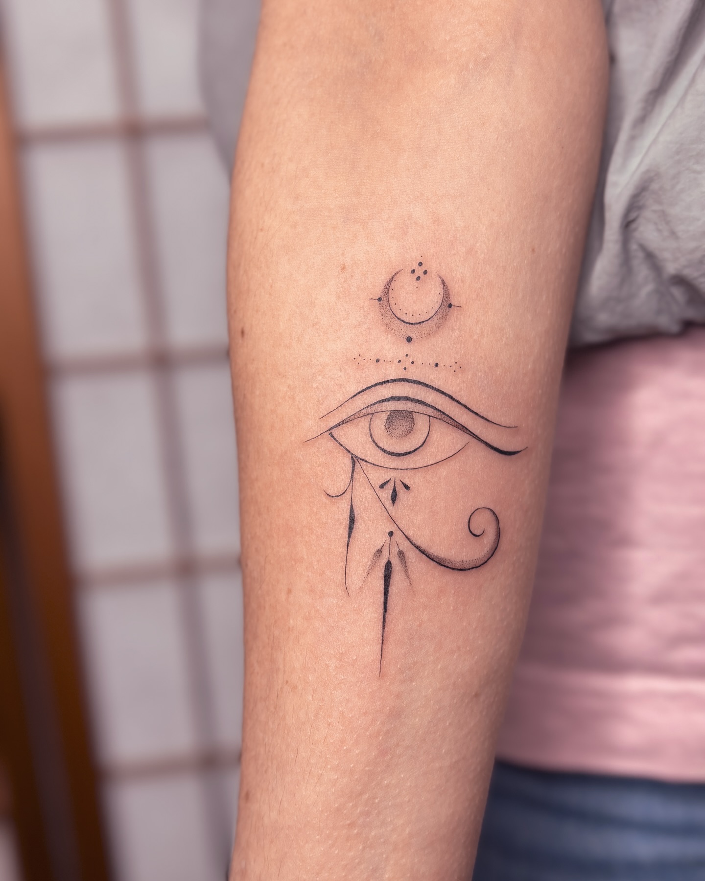 Radiant Eye, Unalome, and Crescent Moon Protection Tattoo