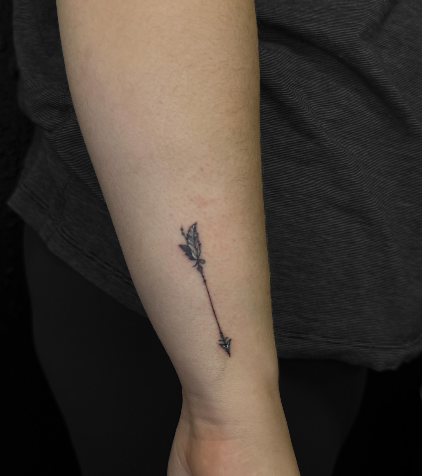This tiny arrow tattoo brings a steady and focused look with its slim line and soft feather detailing.