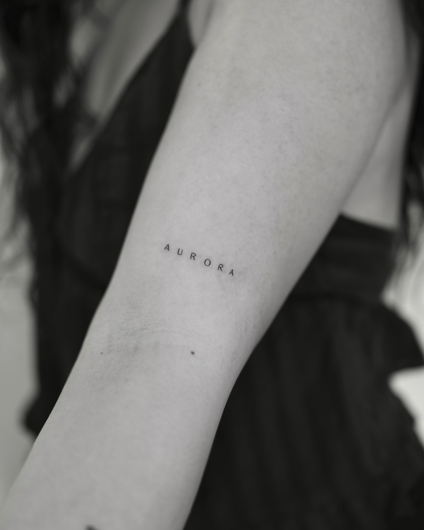 This tiny “AURORA” word tattoo uses spaced lettering that gives the name a soft, balanced look on the arm.