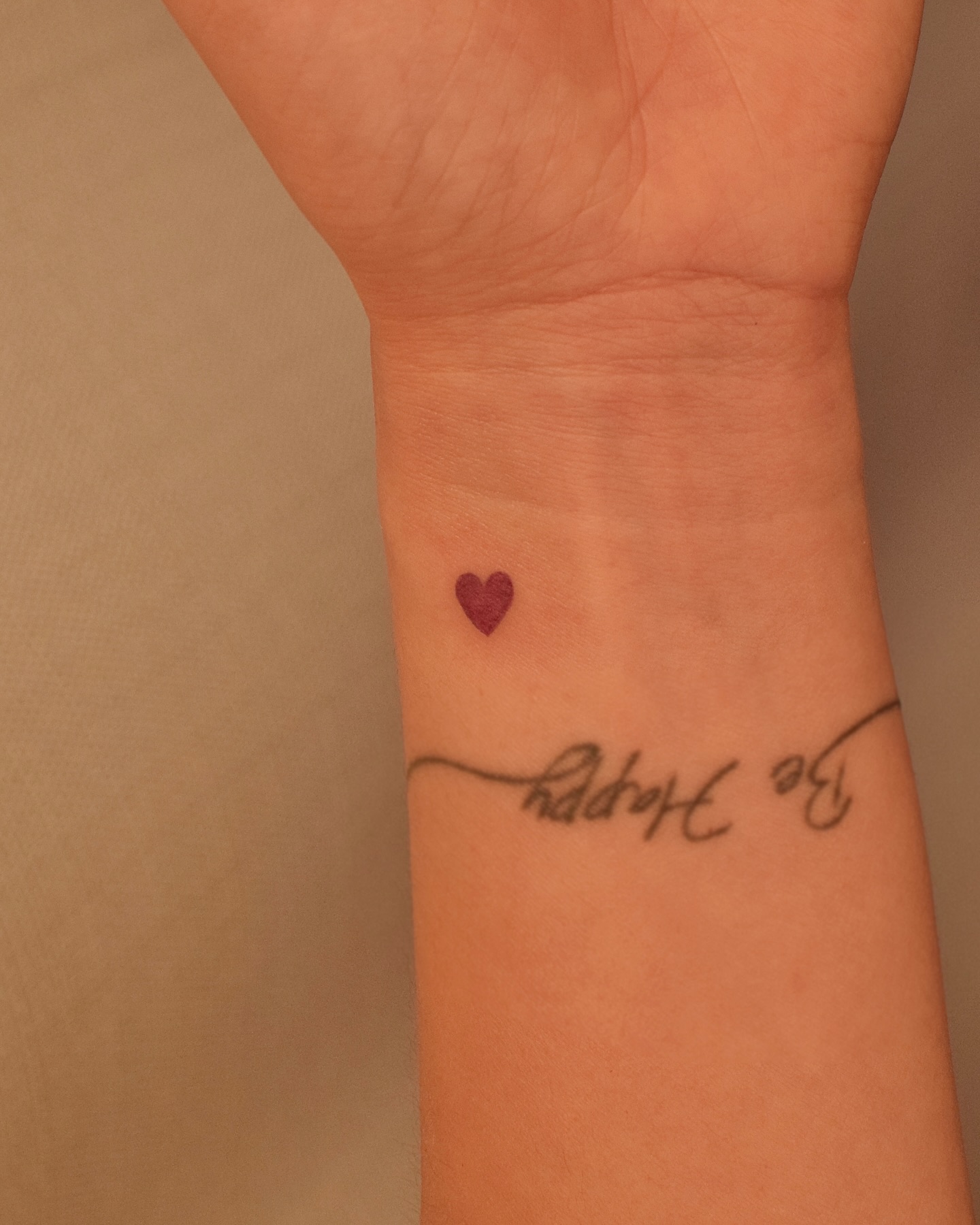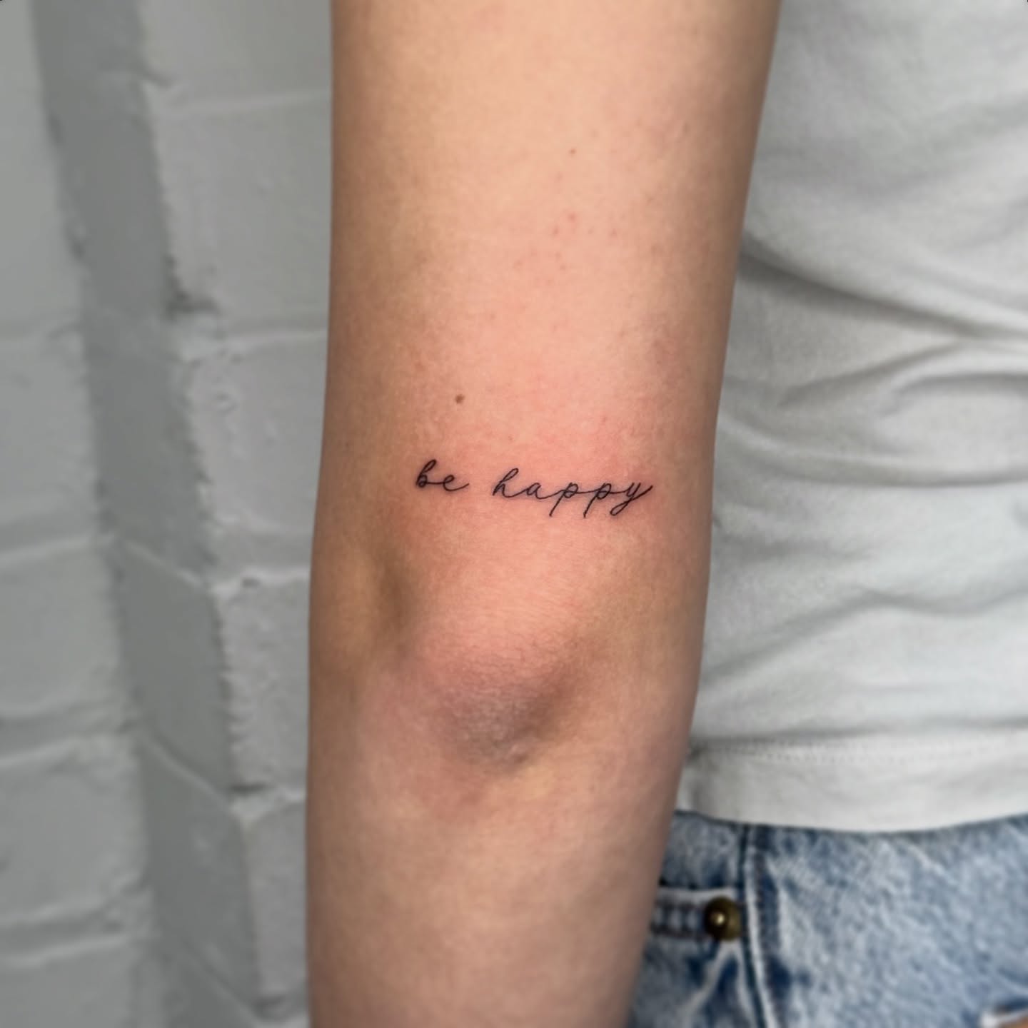 This tiny “be happy” script tattoo uses soft, handwritten lettering to create a gentle and encouraging message on the arm.