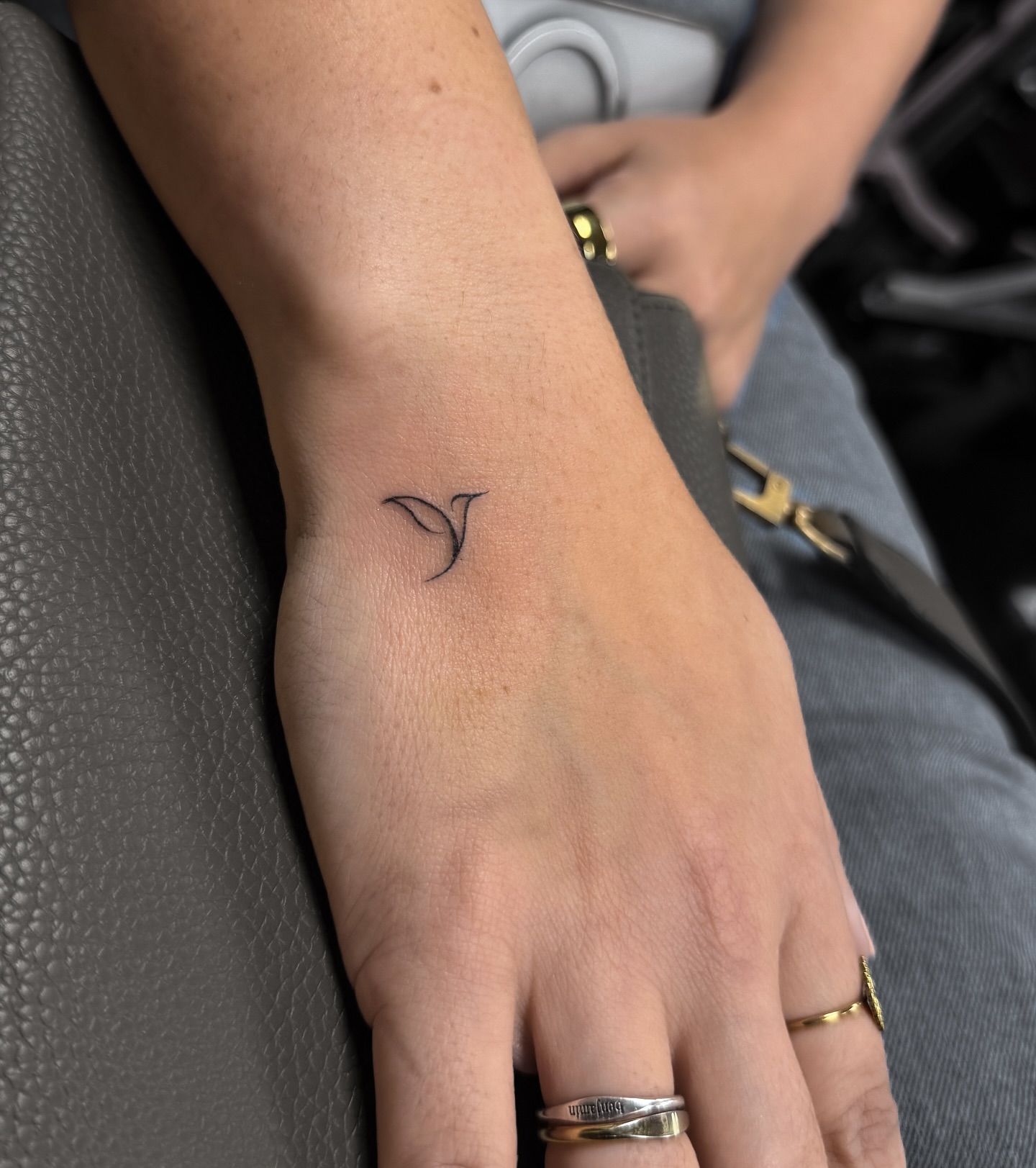 This tiny bird tattoo uses clean, curved lines to create a soft and graceful silhouette. The shape sits lightly on the hand, giving it a calm and open feeling.