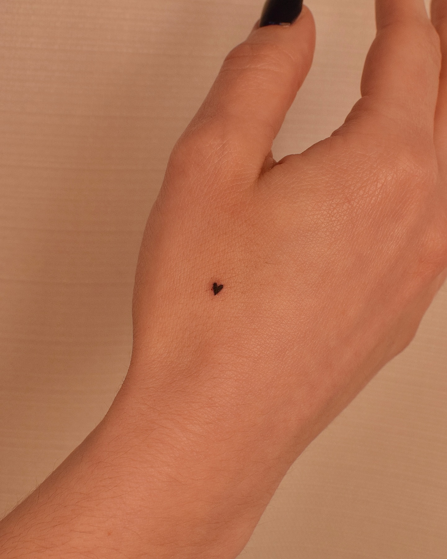 This tiny black heart tattoo rests just above the hand, creating a simple yet steady touch of expression.