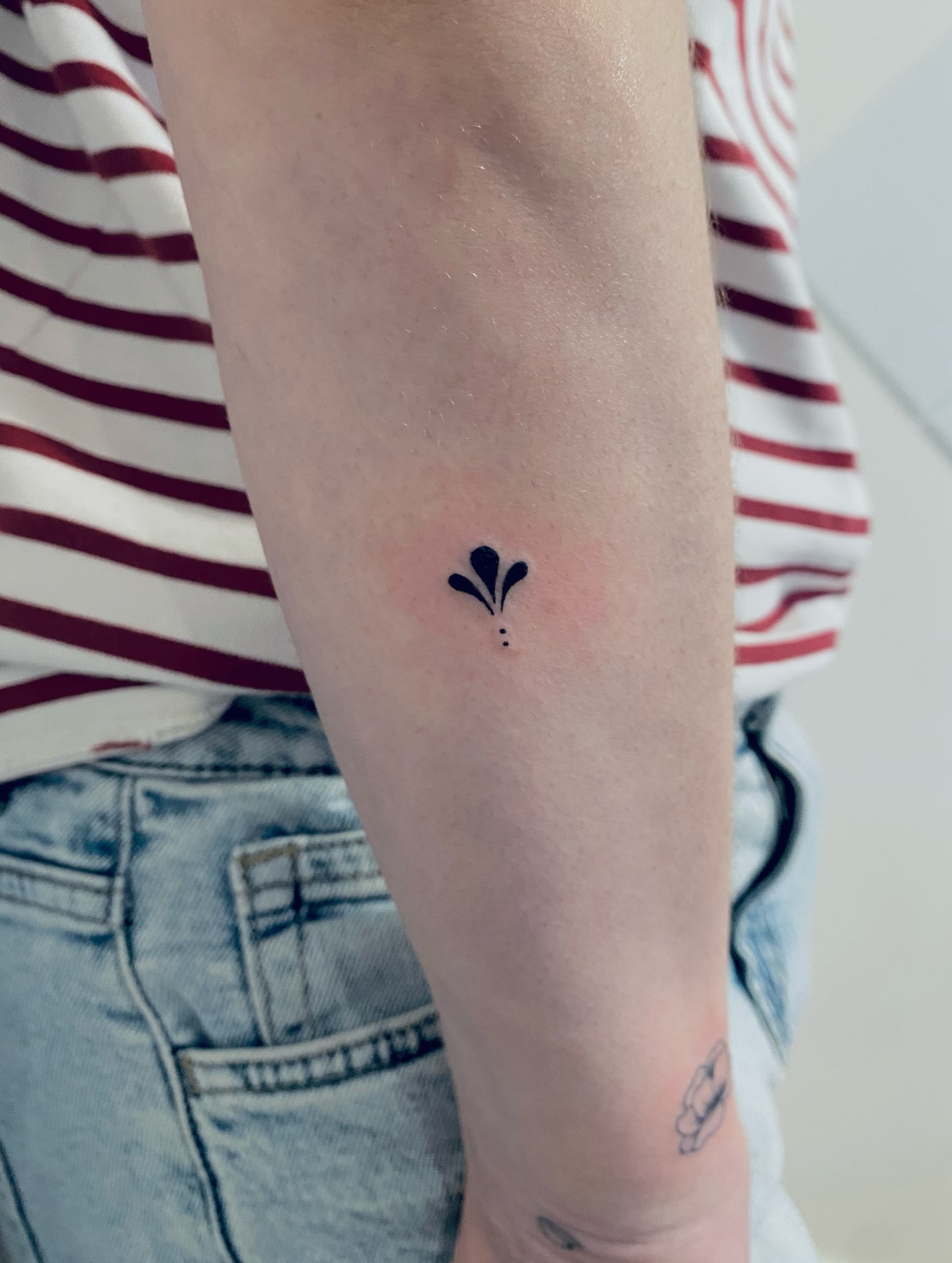 The balanced arrangement creates a graphic, structured look that stands out clearly against the skin. Sharp black ink gives the design strong presence despite its small size. Positioned on the forearm, the symbol rests in a spot that feels natural and open.