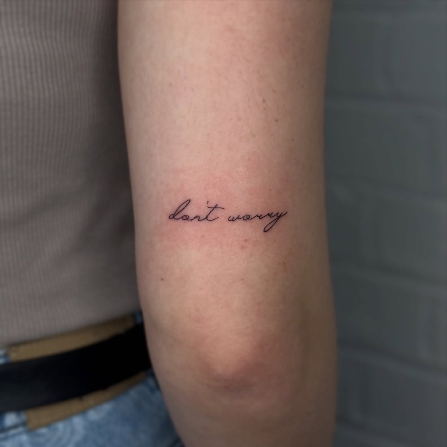 This tiny “don’t worry” tattoo uses soft, handwritten script to create a calm and reassuring message on the arm.