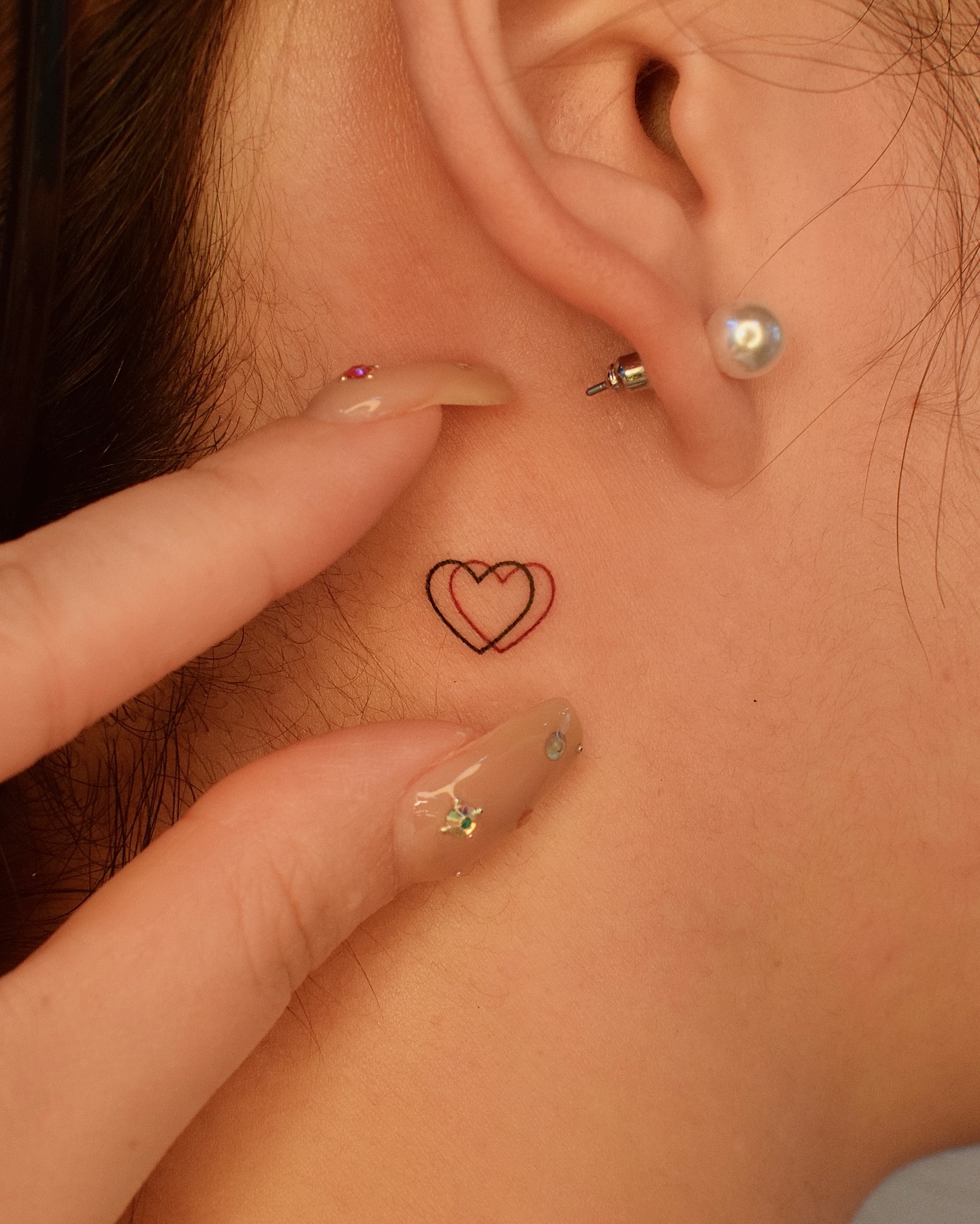 This tiny double-outline heart tattoo sits just below the ear, creating a soft accent near the neckline.