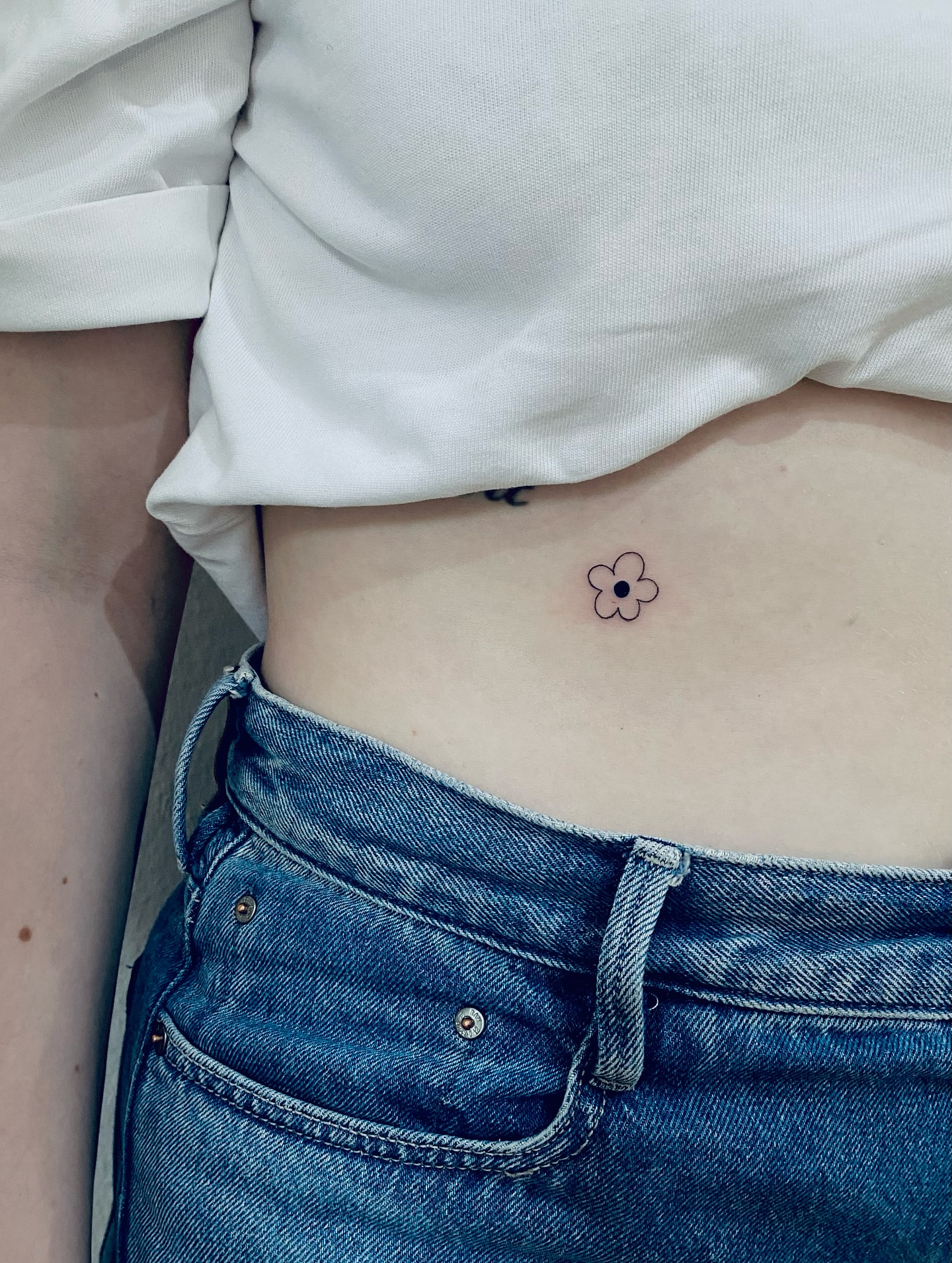This small flower outline rests on the hip, shaped with smooth petals surrounding a single filled center.