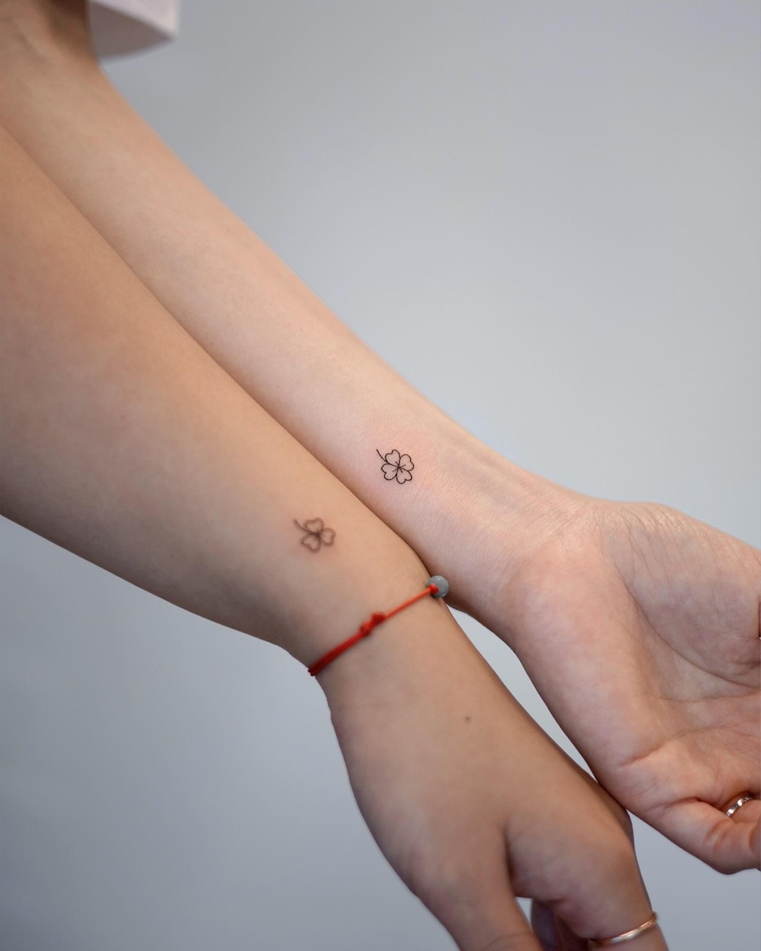 These tiny matching four-leaf clover tattoos create a simple design that carries a clear message of luck and connection.