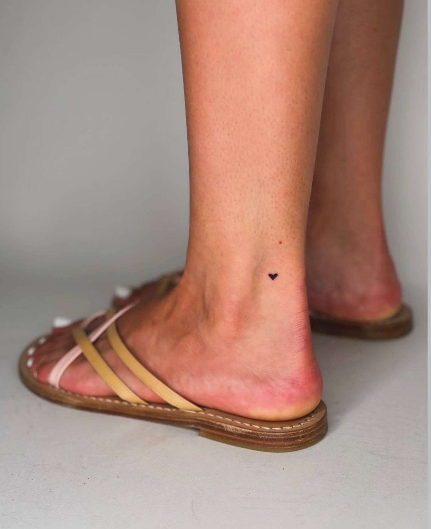 This tiny heart ankle tattoo uses a small, bold shape that sits neatly above the heel. The solid black heart keeps the message clear without needing extra lines or decoration.