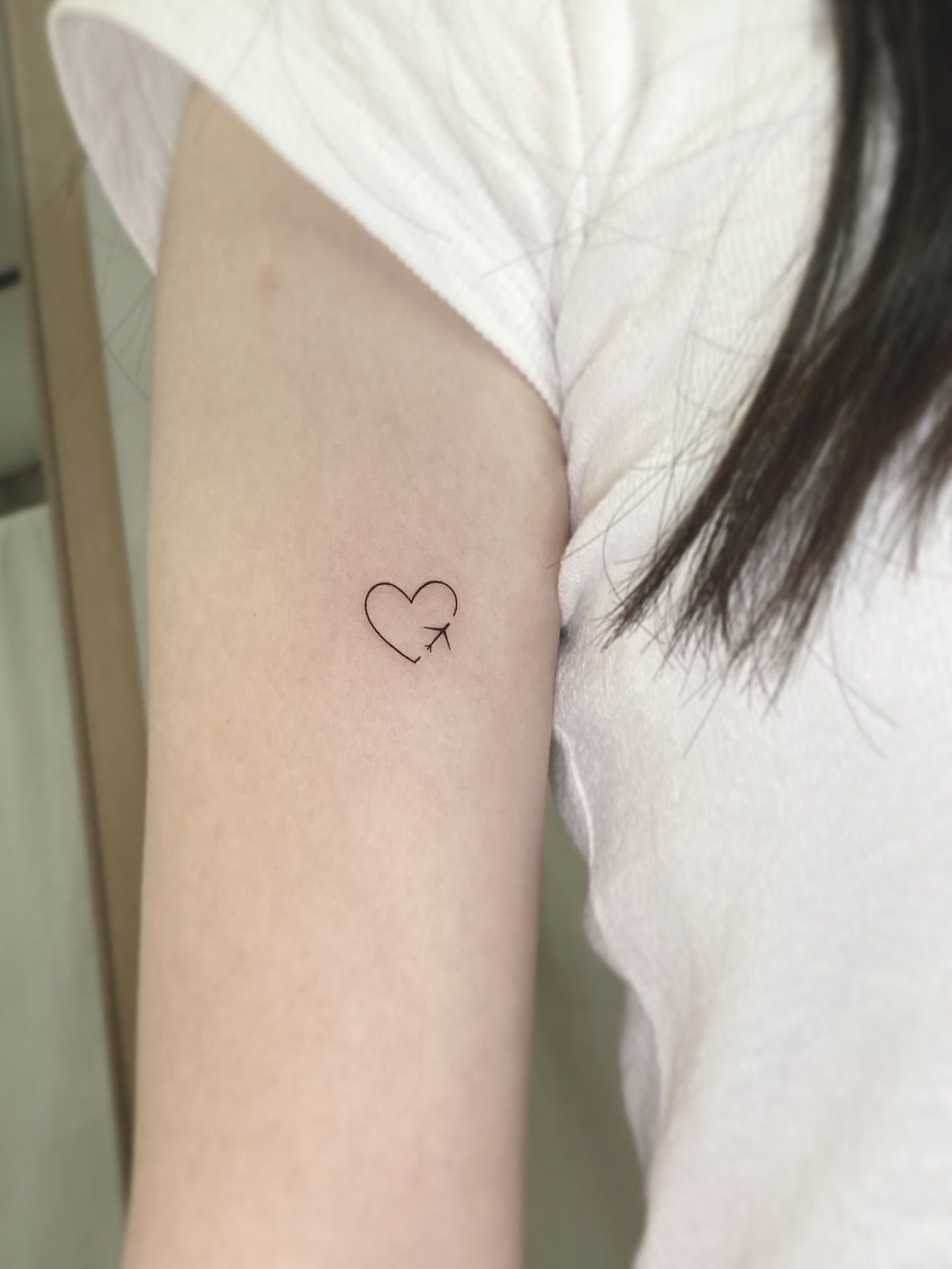 The airplane sits at the edge of the heart, creating a gentle sense of movement and adventure. The placement on the upper arm keeps the design easy to notice without feeling bold.