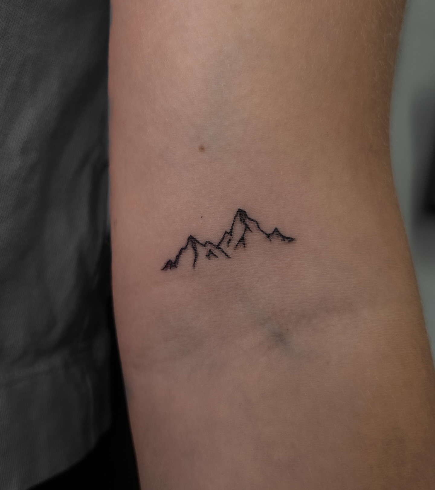 This tiny mountain tattoo shows a short row of peaks drawn with clean black outlines. The shape stays minimal, yet it carries a strong presence.