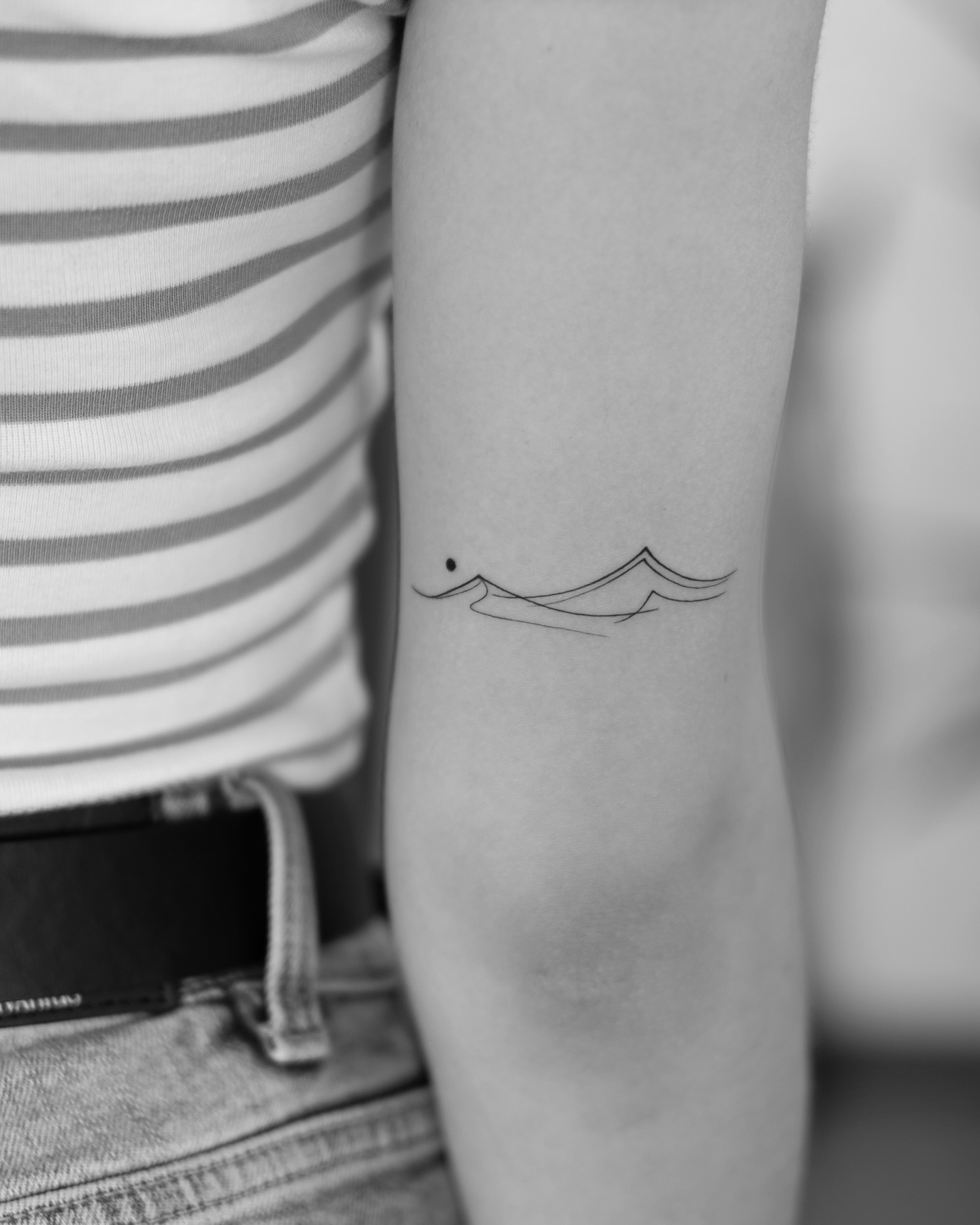 The curved peaks flow lightly across the arm, and the small dot above them adds a subtle sun. The design stays minimal, offering a sense of balance without overwhelming the space. Mountain imagery often represents endurance, stability, or perspective gained through difficult experiences.
