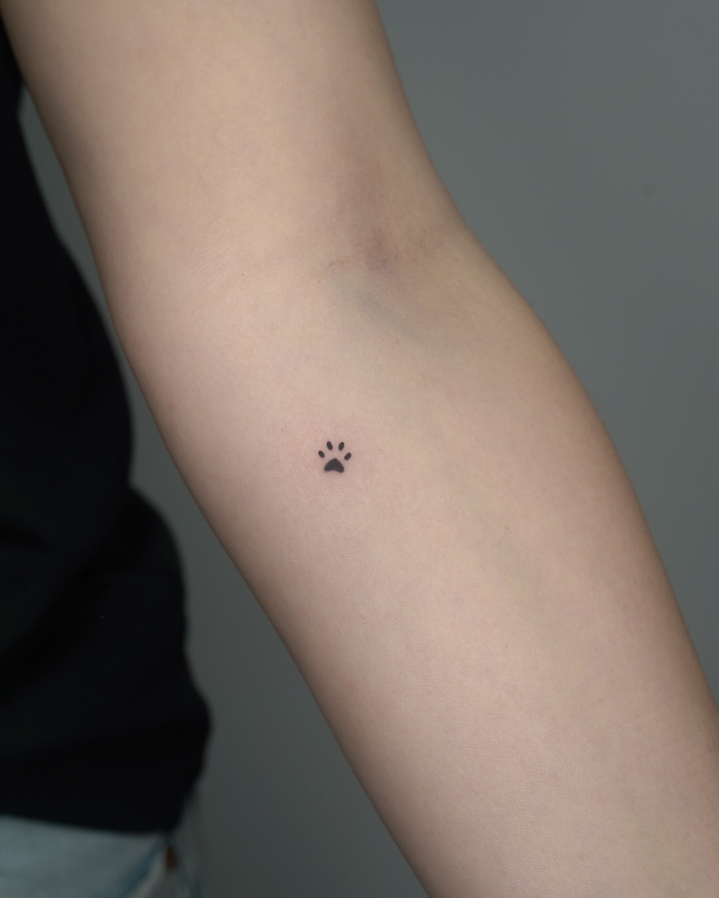 This tiny paw print tattoo uses simple black ink to create a clean, meaningful design.