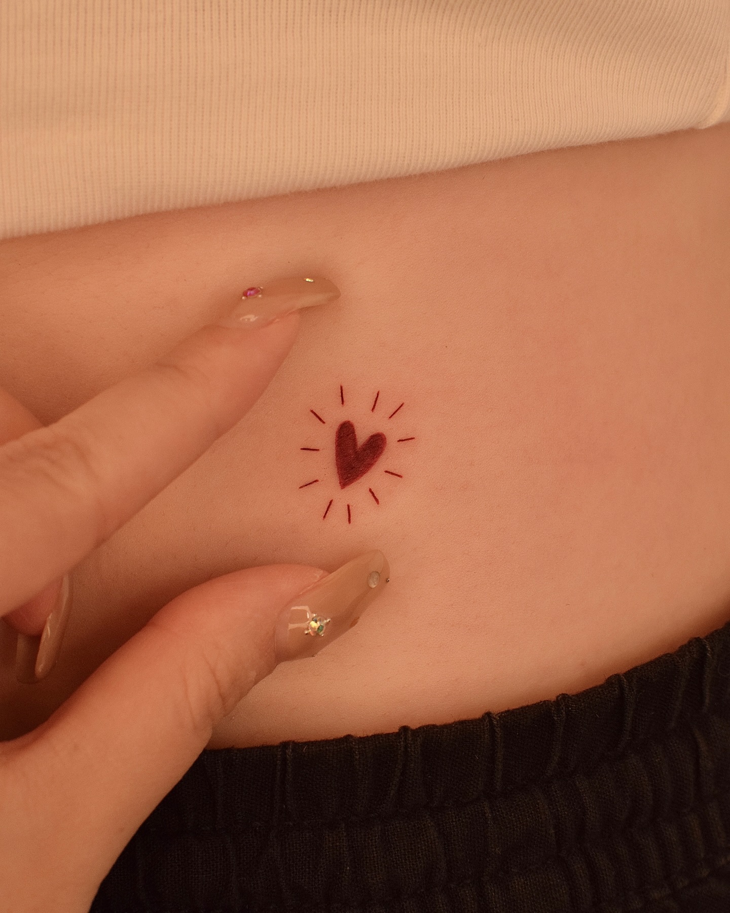 This tiny radiant heart tattoo uses a filled red heart surrounded by short, sharp rays. The effect creates a warm burst of energy, making the design feel bright without overpowering the area.