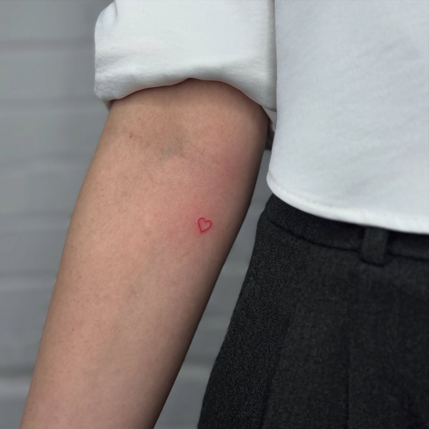 This tiny red heart outline tattoo keeps everything simple, using bright red ink to create a soft, clean shape.