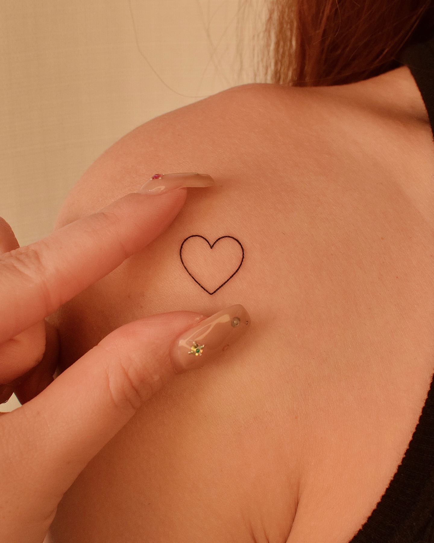This tiny shoulder heart tattoo features a clean, open outline placed neatly on the upper shoulder.
