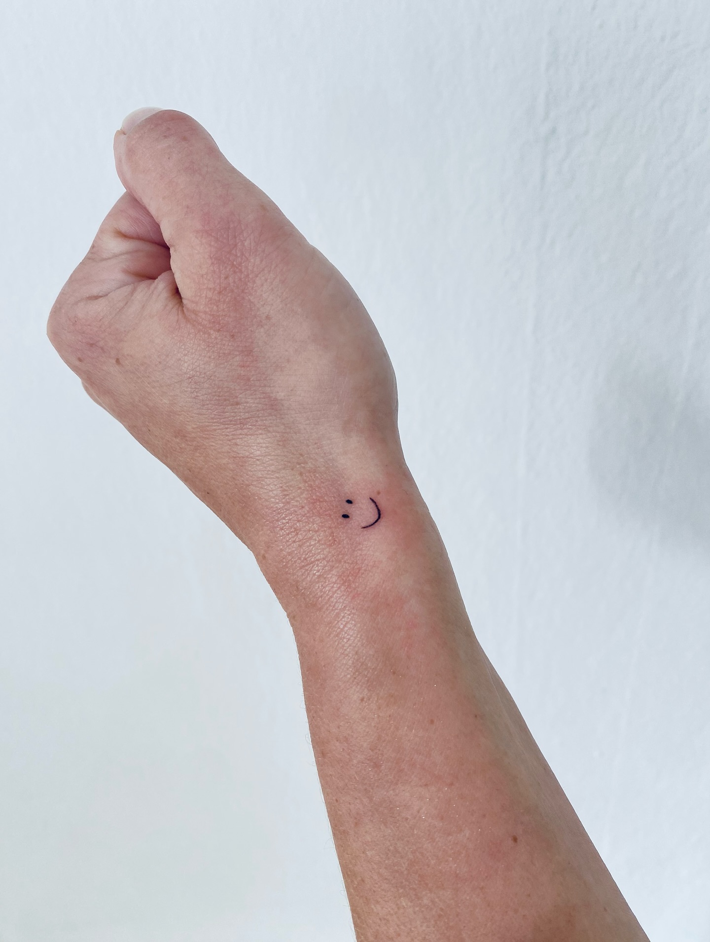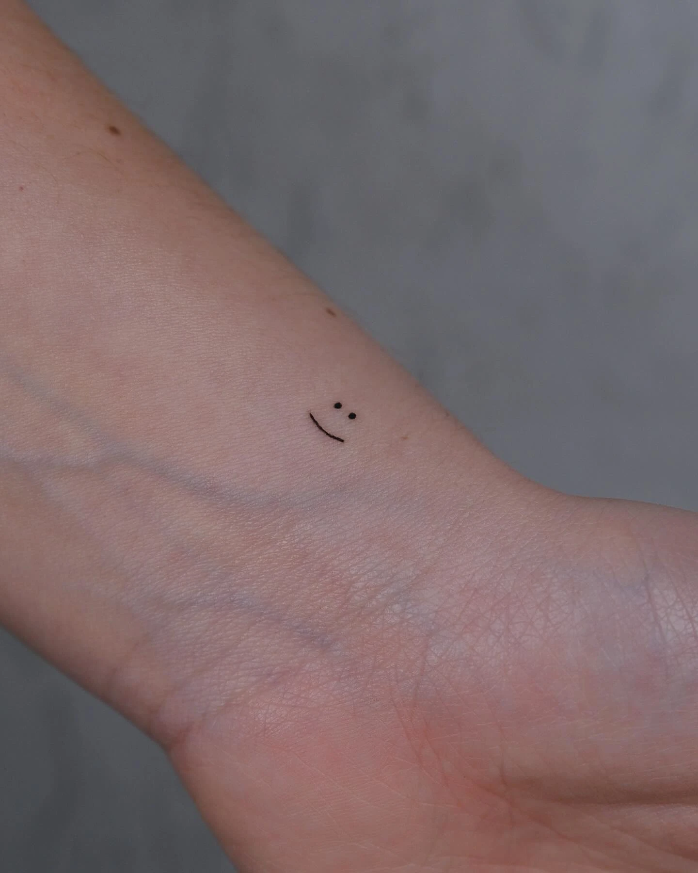 This tiny wrist smiley uses a curved line and two small dots to form a simple, cheerful expression.
