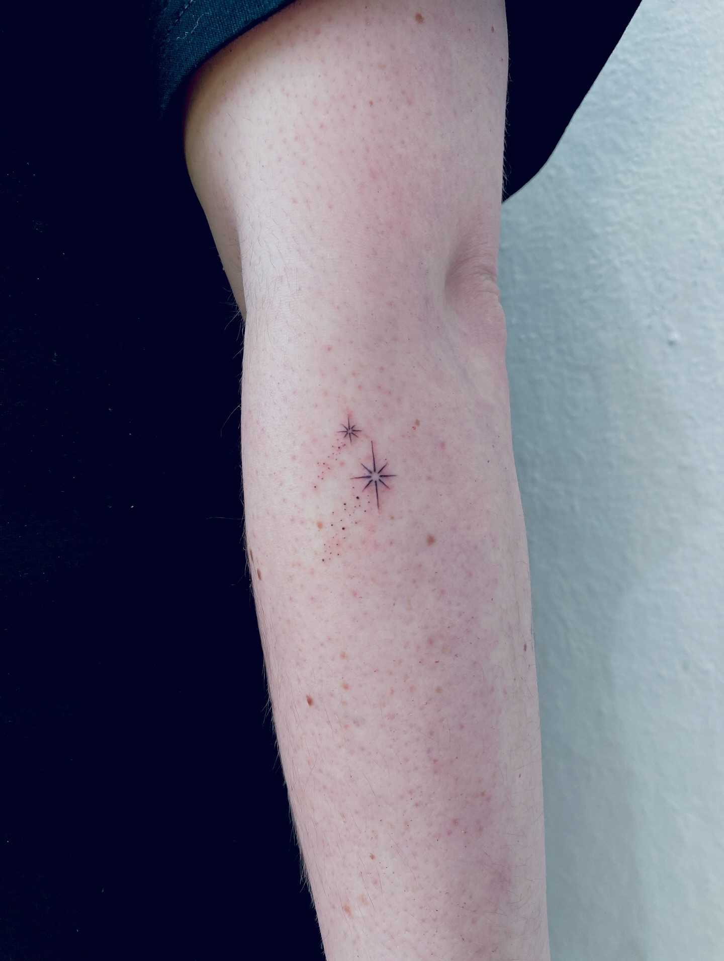 A pair of tiny stars appears on the forearm, surrounded by delicate dotting that creates a soft, glowing effect.
