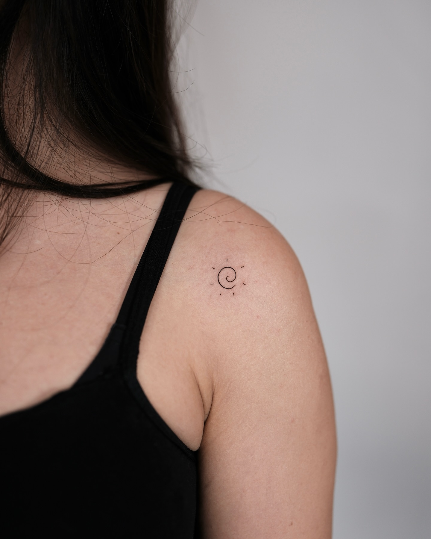 This tiny spiral sun tattoo creates a light and warm feeling through its simple swirl and short rays.