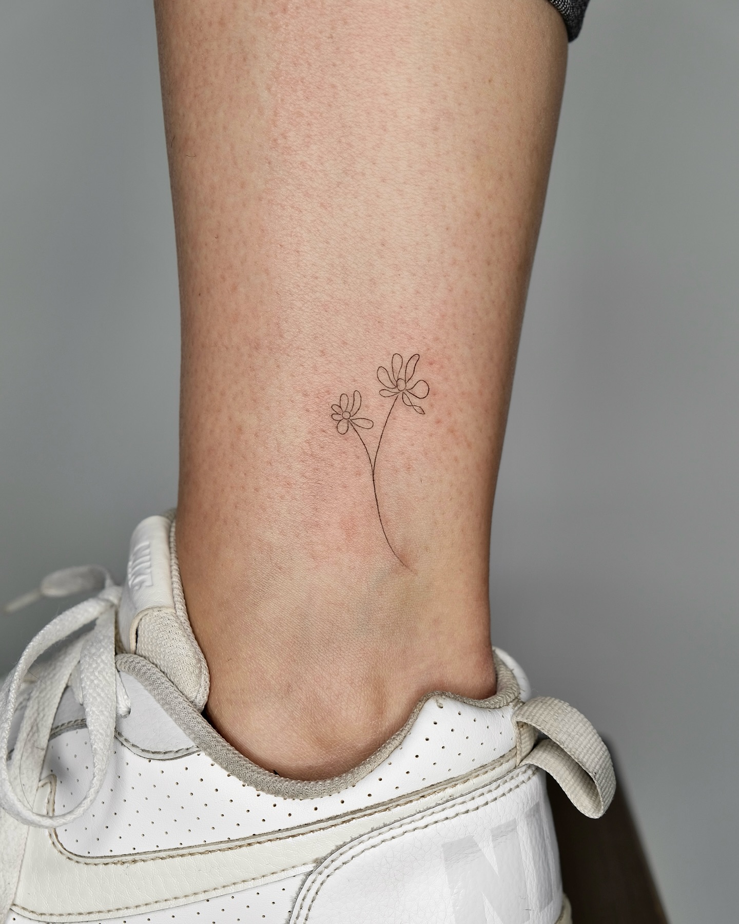 The lines stay soft and minimal, creating a calm look on the ankle. Paired flowers often reflect unity, shared history, or supportive connections that bring steady comfort. The simplicity makes the artwork feel light, almost like a quick pencil sketch.