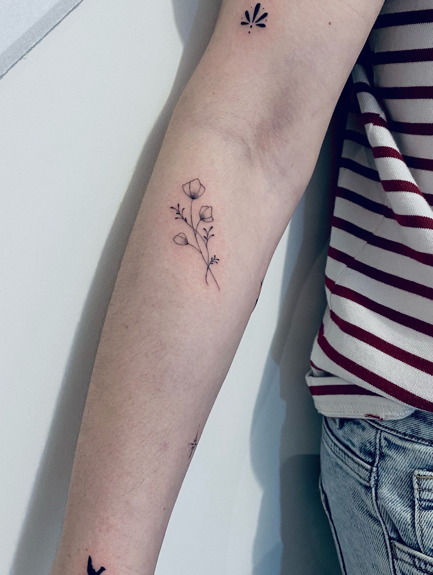 This tiny wildflower stem tattoo uses fine, delicate lines to create a calm and natural design on the forearm.