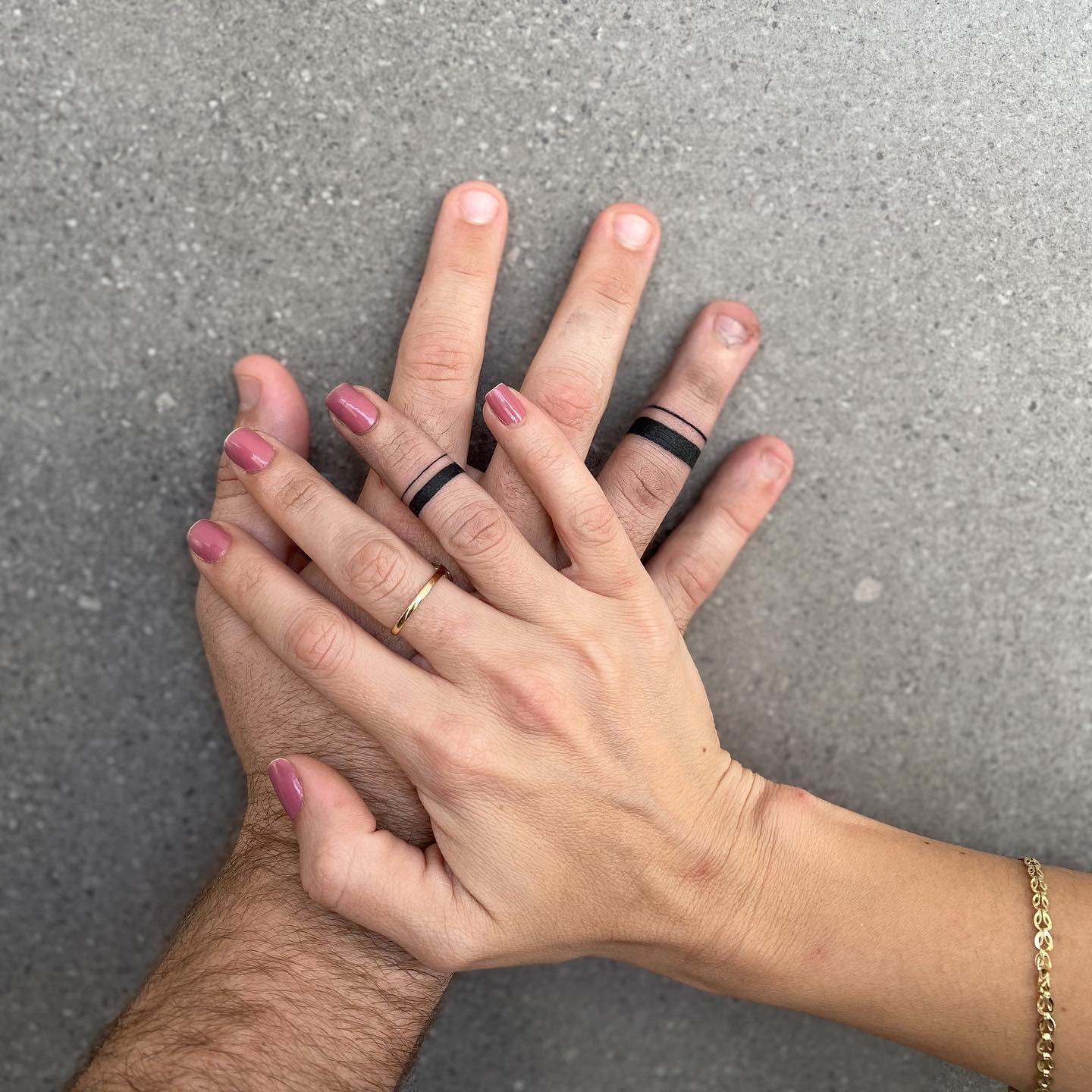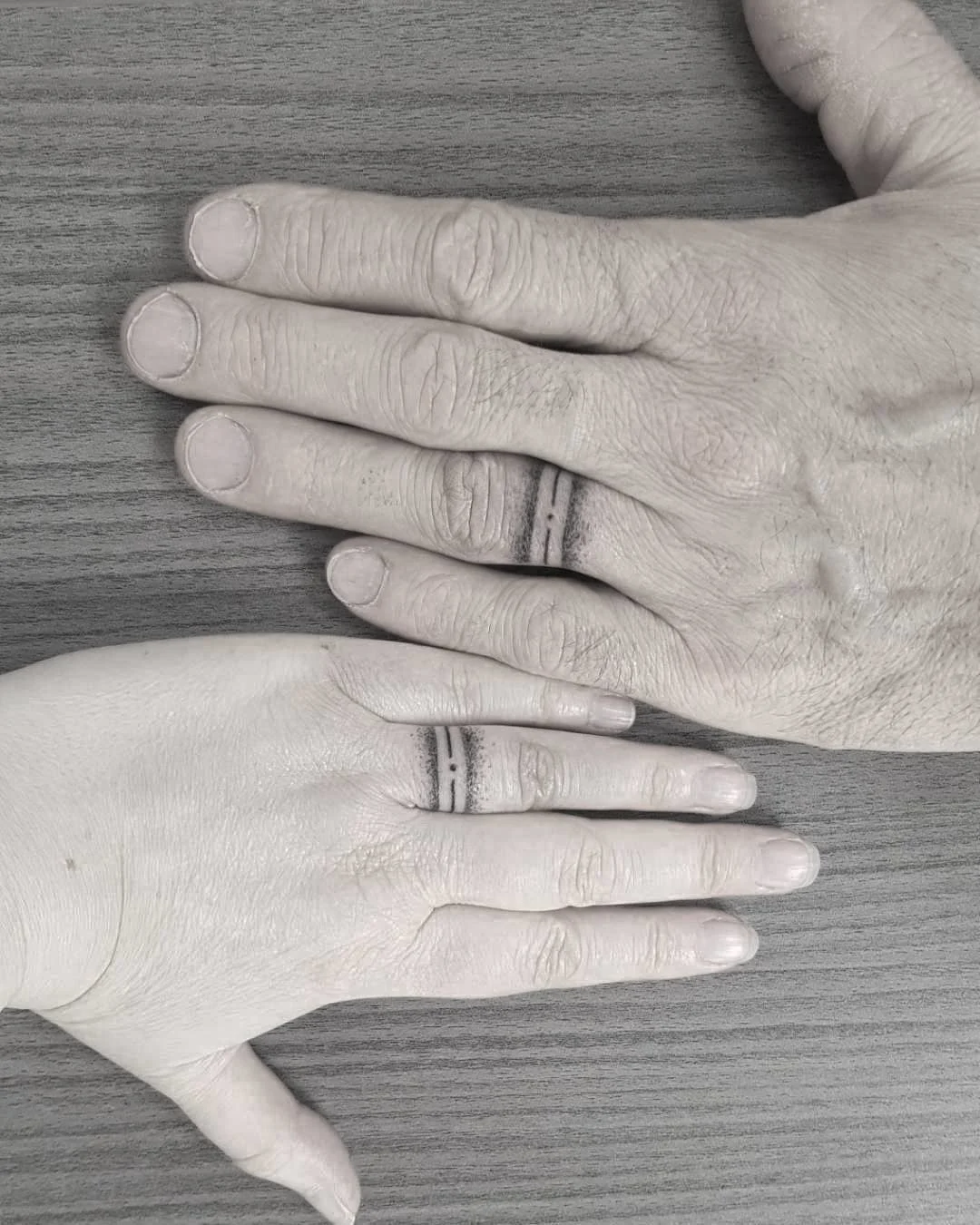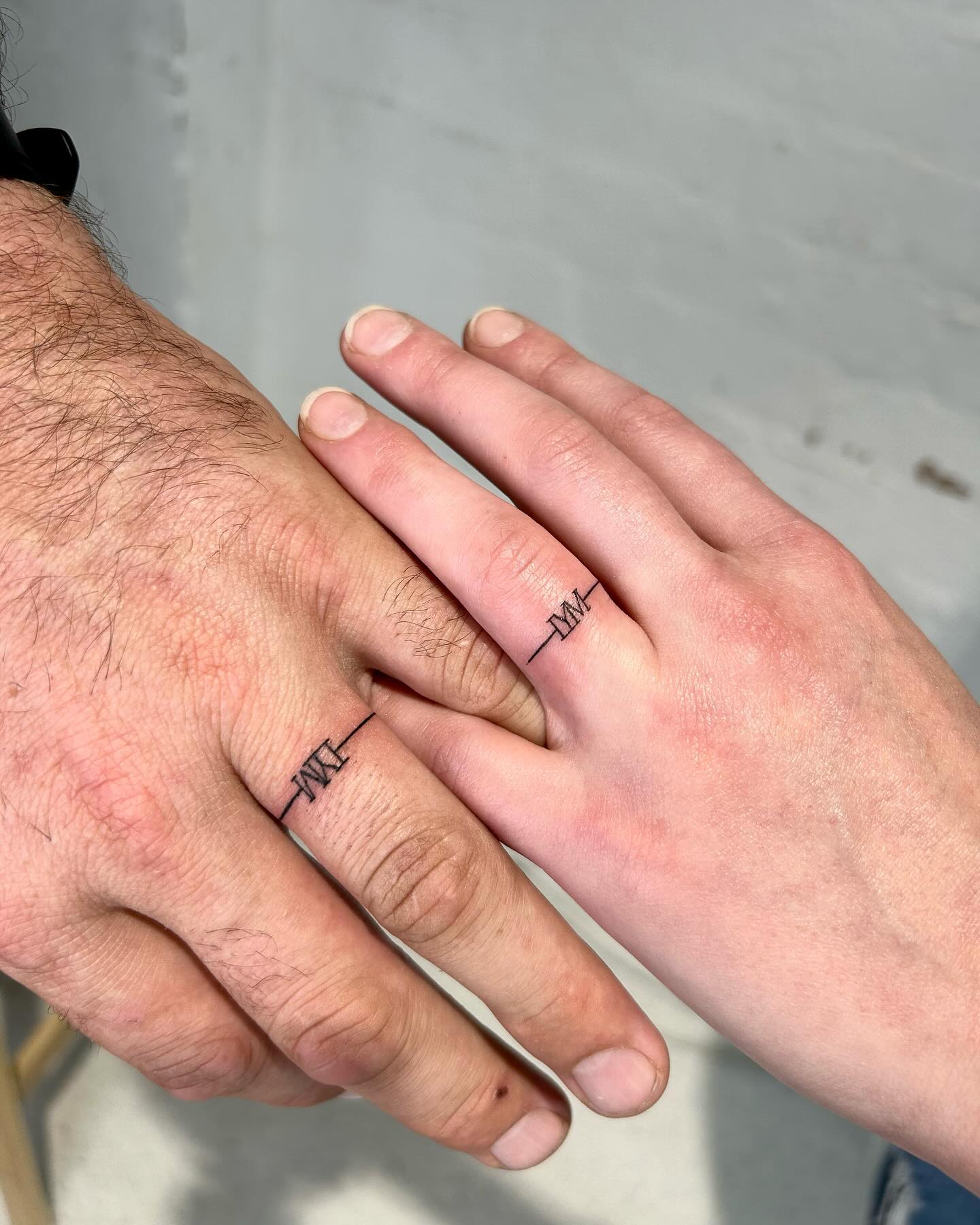This bold and fine line wedding band tattoo gives couples a simple and modern way to show commitment.