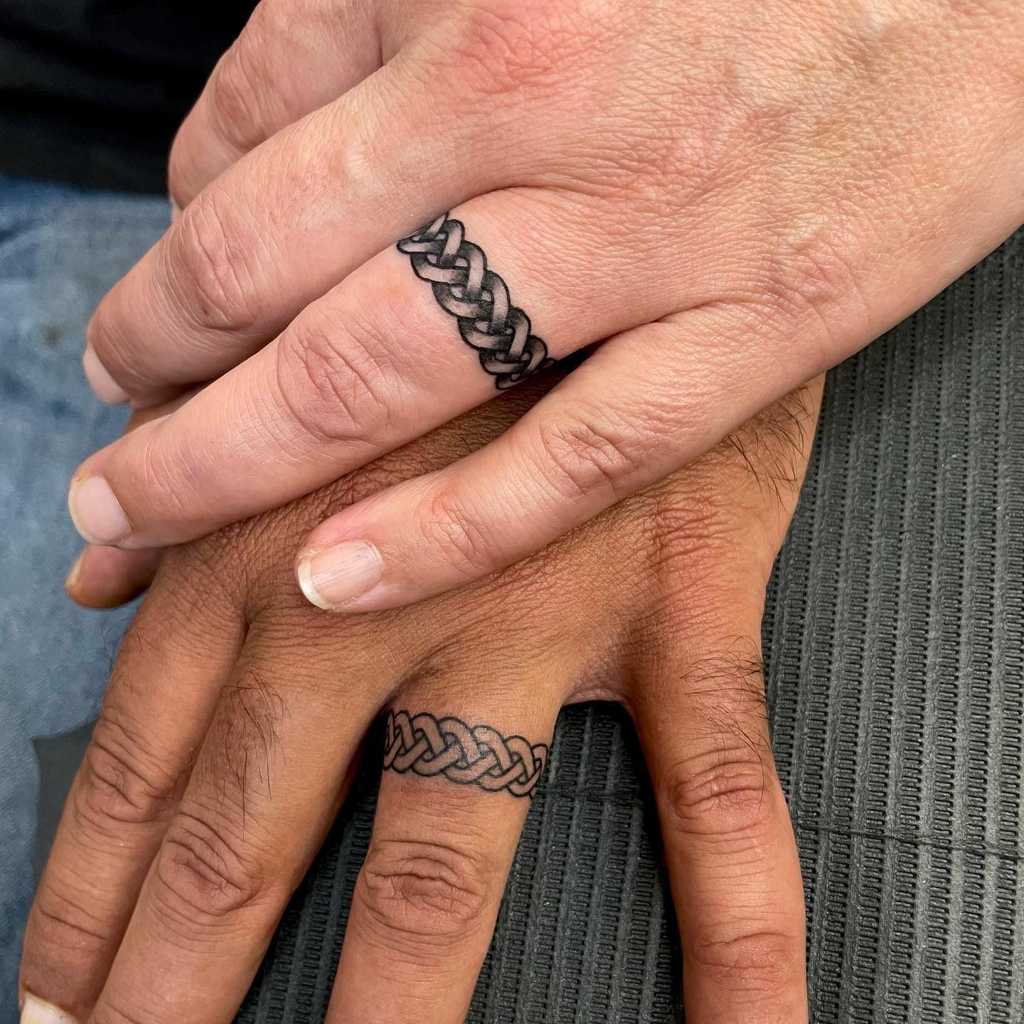 This Celtic braided wedding ring tattoo offers couples a timeless symbol of connection.