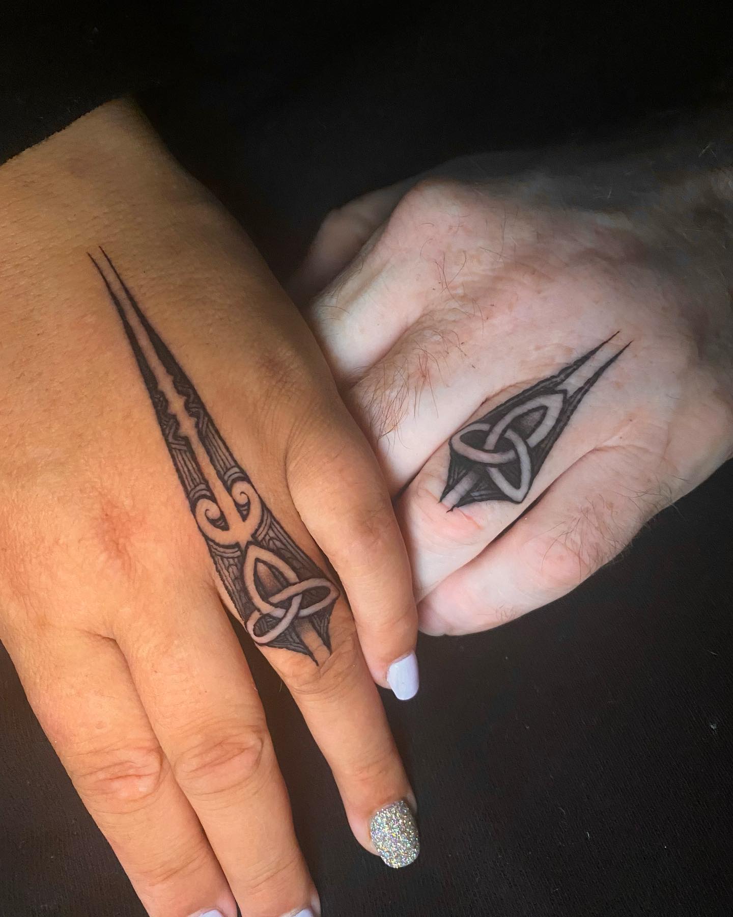The knot sits on the finger and represents unity and an unbroken bond. From there, the design extends onto the hand with sharp, flowing lines that create motion and structure.