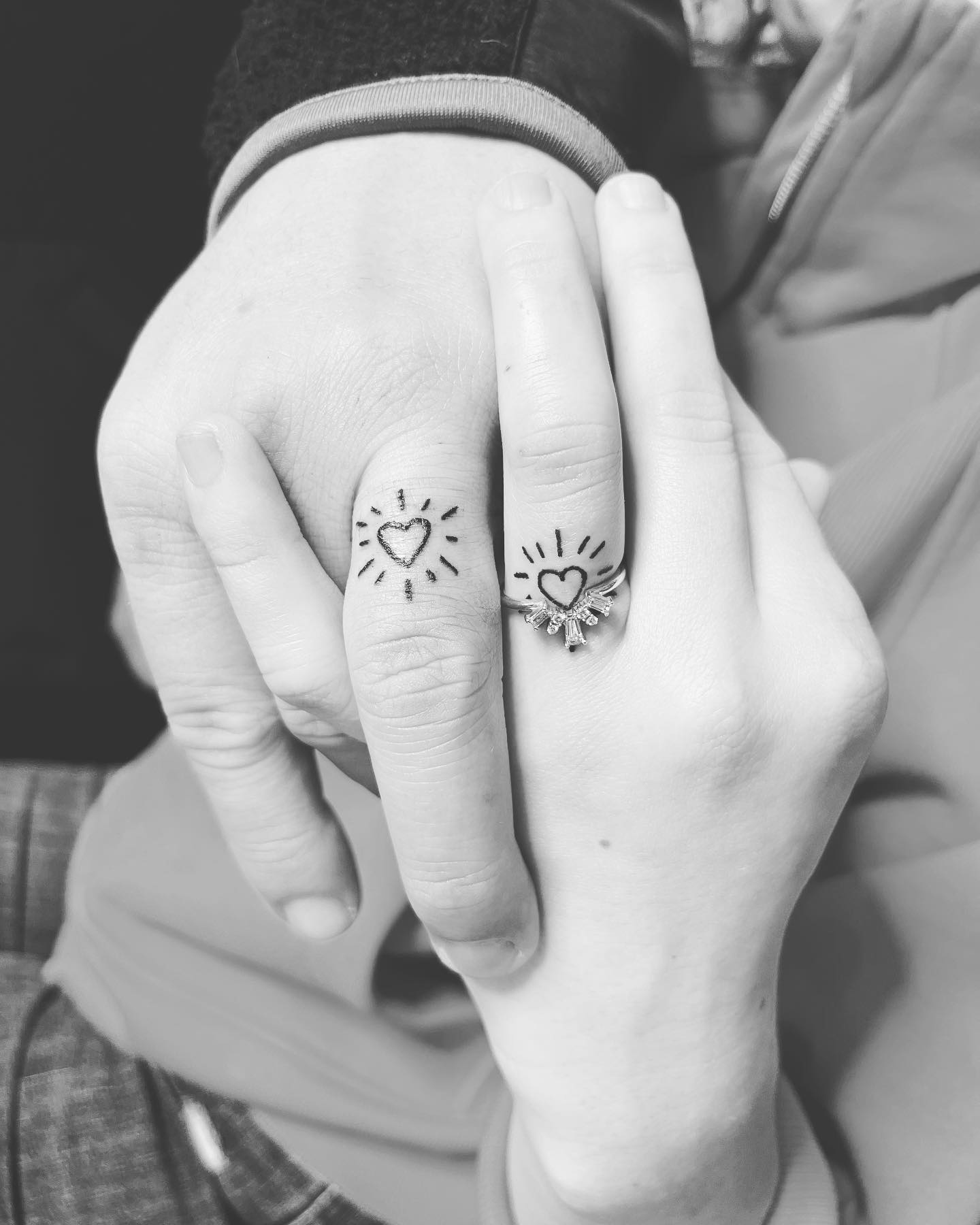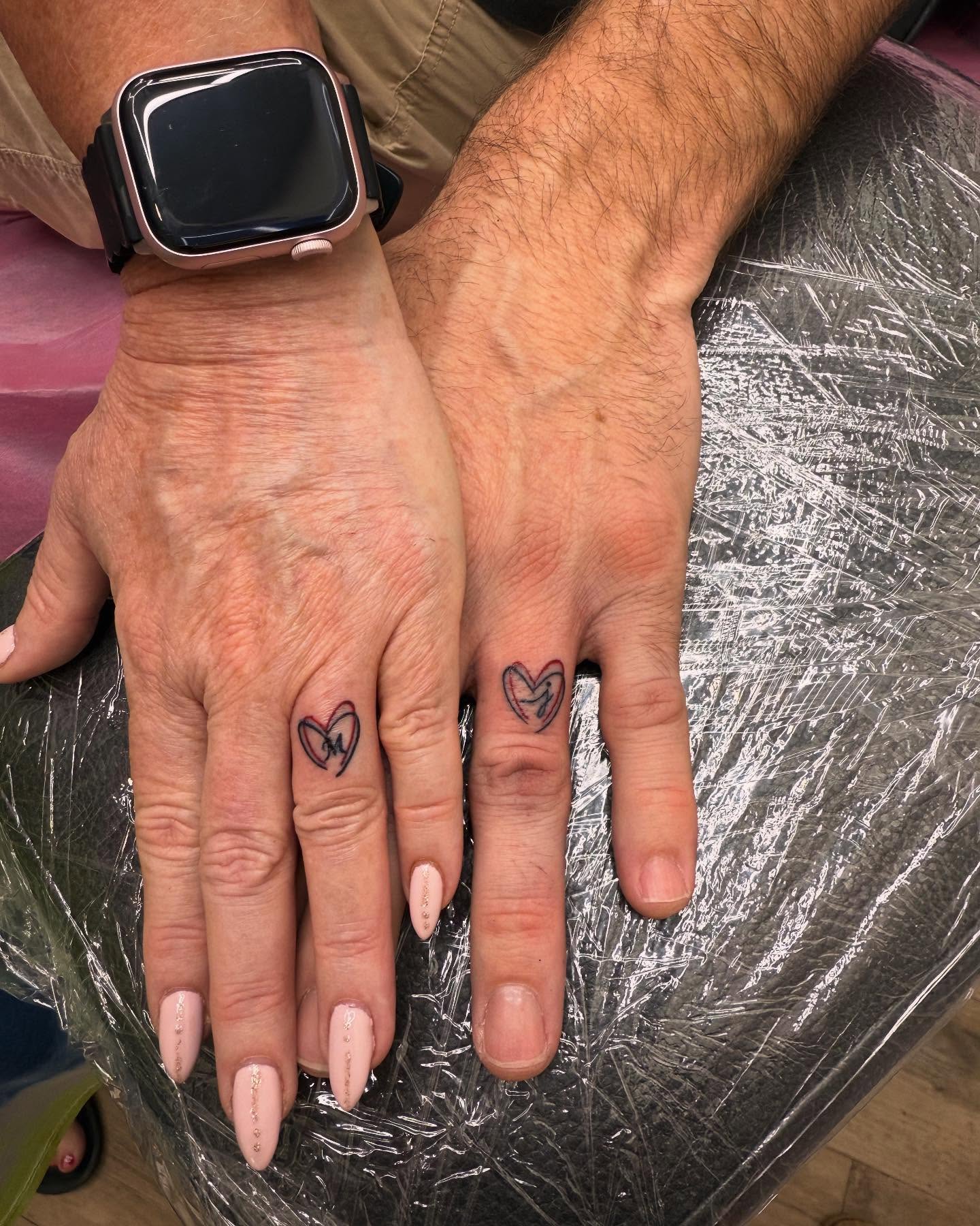 This radiant heart wedding band tattoo gives couples a bright, expressive way to symbolize love.
