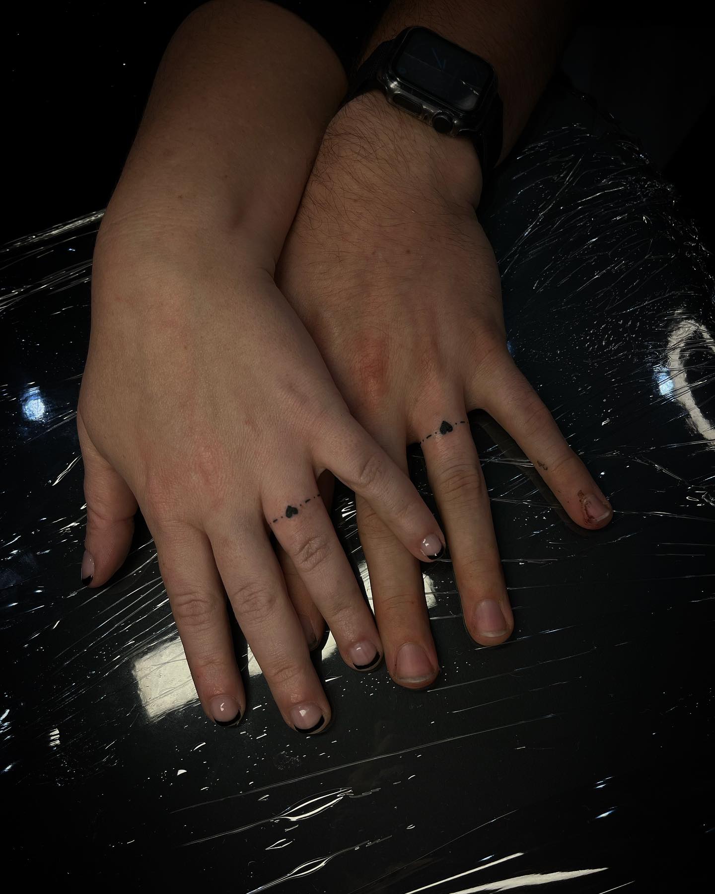 One partner wears a thick black band that feels strong and grounded, while the other has a single fine line that keeps the design light and minimal. The contrast lets each person express their own style while still sharing a clear connection.