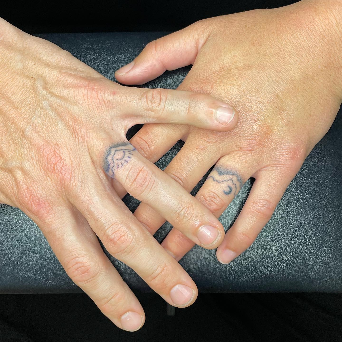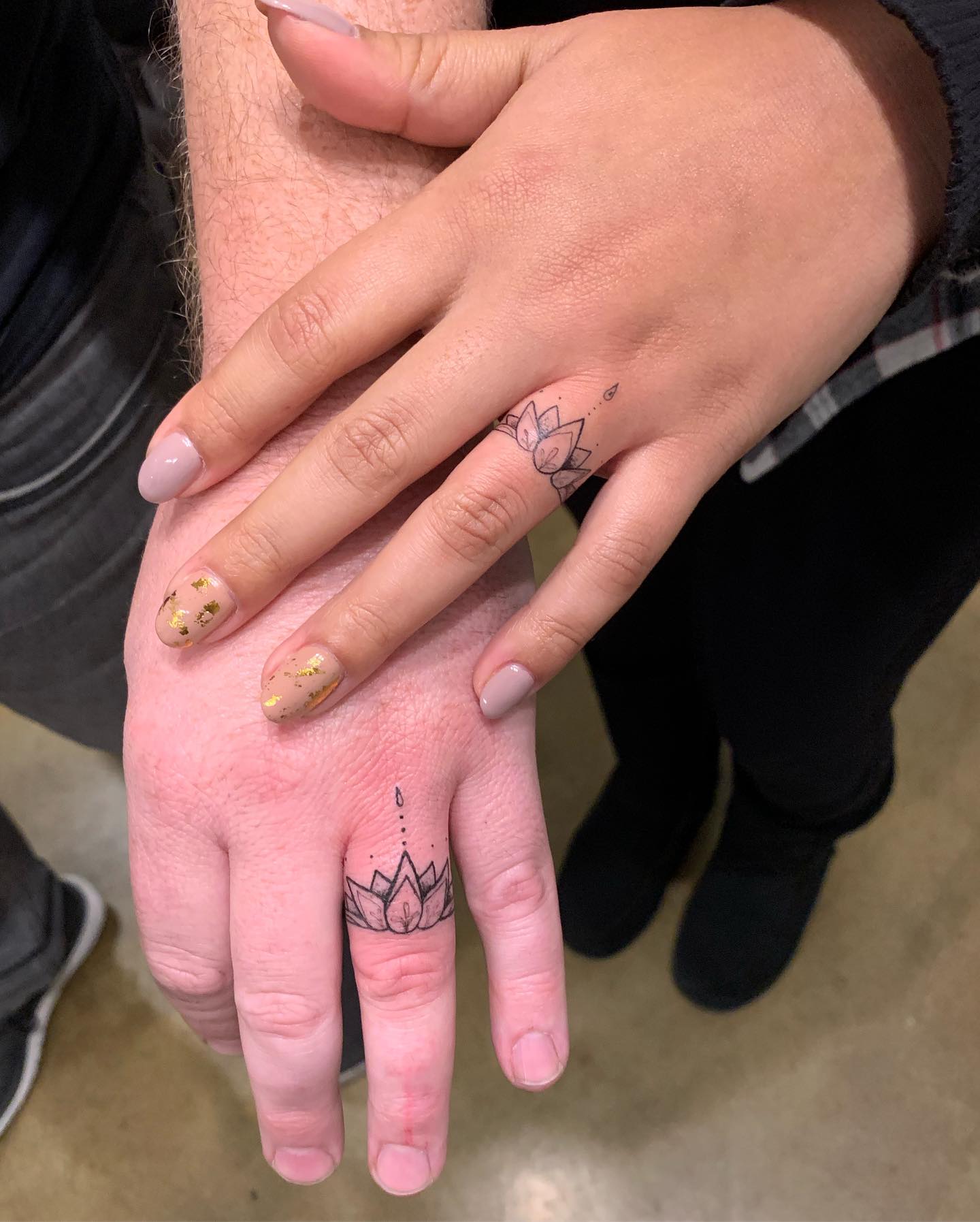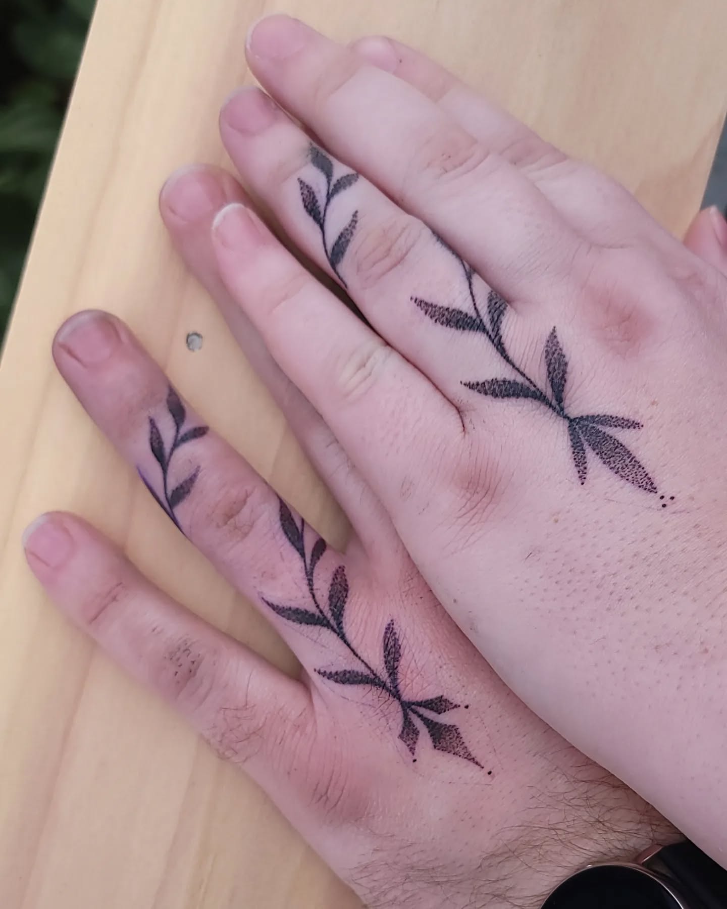 The other ring uses soft leaves and gentle curves to create a nature-inspired design that feels warm and expressive. Together, the tattoos balance structure and softness while keeping a shared theme of connection.