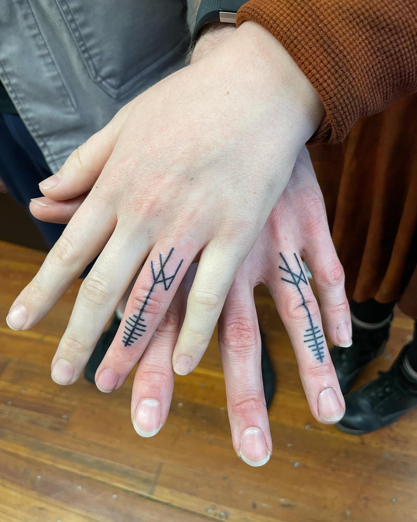 Each partner wears a matching rune-inspired design with long vertical lines and smaller strokes that mimic traditional markings.