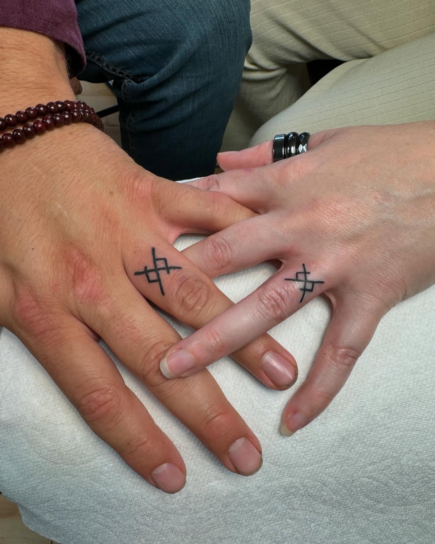 This rune symbol wedding ring tattoo offers couples a simple design with deep symbolic meaning.