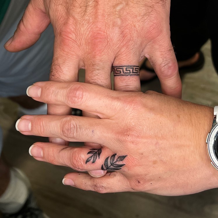 This Greek key and leaf vine wedding ring tattoo pair gives couples two meaningful designs that complement each other beautifully.