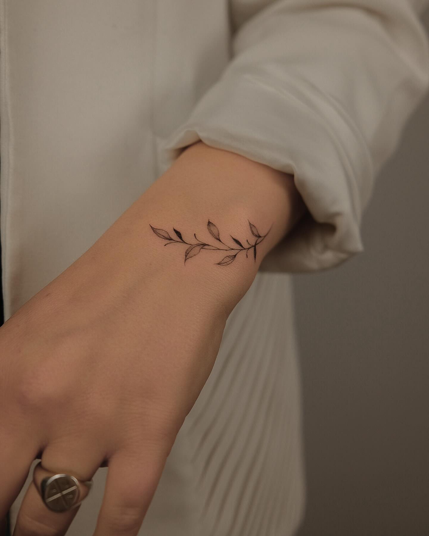 This wrist tattoo features a thin branch with softly shaded leaves that curve gently across the skin.